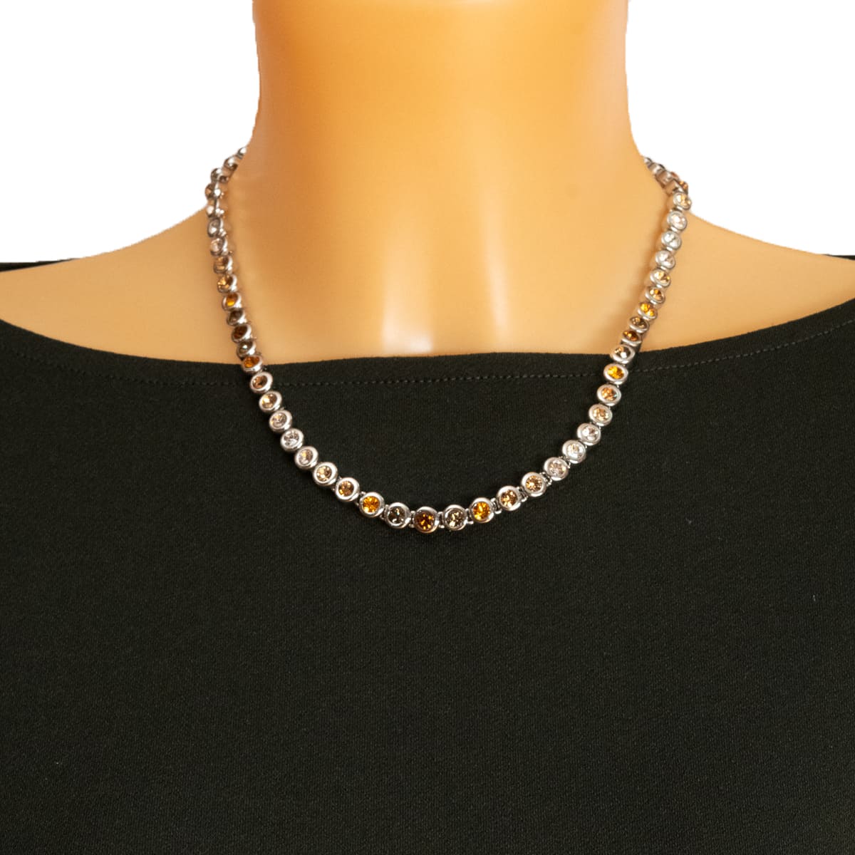 Das zeitlose Collier mit aufeinander abgestimmten Farben ist ein toller Stylingbegleiter. Ein schöner Farbverlauf von braun, topas, orange und weiß wird von edel geschliffenen Schmucksteinen dargestellt. Ein tolles Accessoire, das super zu allen Outfits in Naturtönen kombiniert werden kann.
