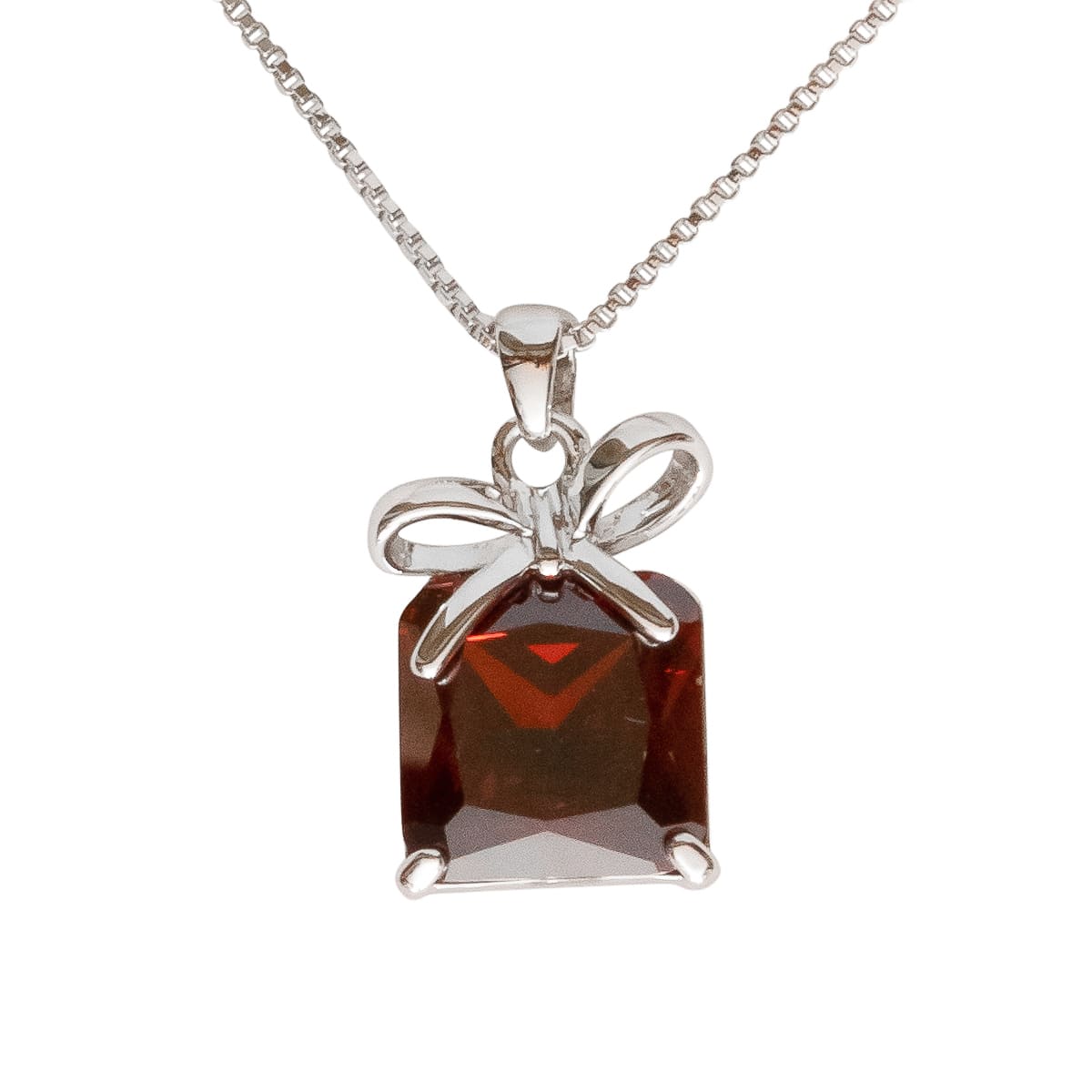 Das perfekte Geschenk! Ein rubinroter Schmuckstein im edlen Facettenschliff wird von einer schicken Schleife begleitet. Der Schliff des Steins sorgt für ein funkelndes Farbspiel. Eine Venezianerkette begleitet den Anhänger, der mit Liebe zum Detail gefertigt wurde.
