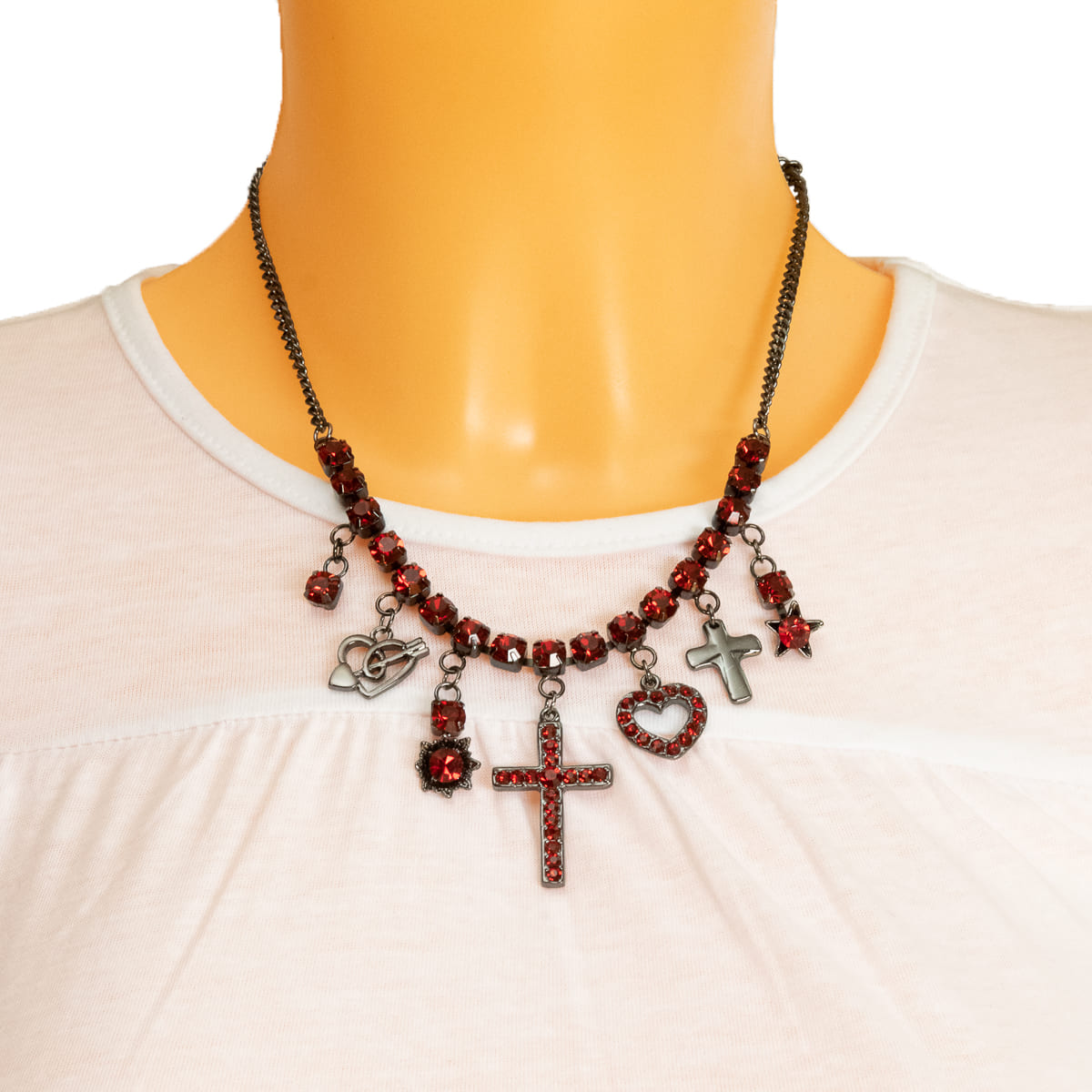 Die auffällige Statement-Kette zeichnet sich auch durch ihre verschiedenen Anhänger zu einem besonderen Schmuckstück aus. Eine dunkle Ankerkette begleitet die rubinroten Schmucksteine im Facettenschliff gekonnt. Die Anhänger als Kreuz, Herz, Stern und Blume sind zum Teil mit funkelnden rubinroten Schmucksteinen besetzt. Sehr schön zum Casual-Look.