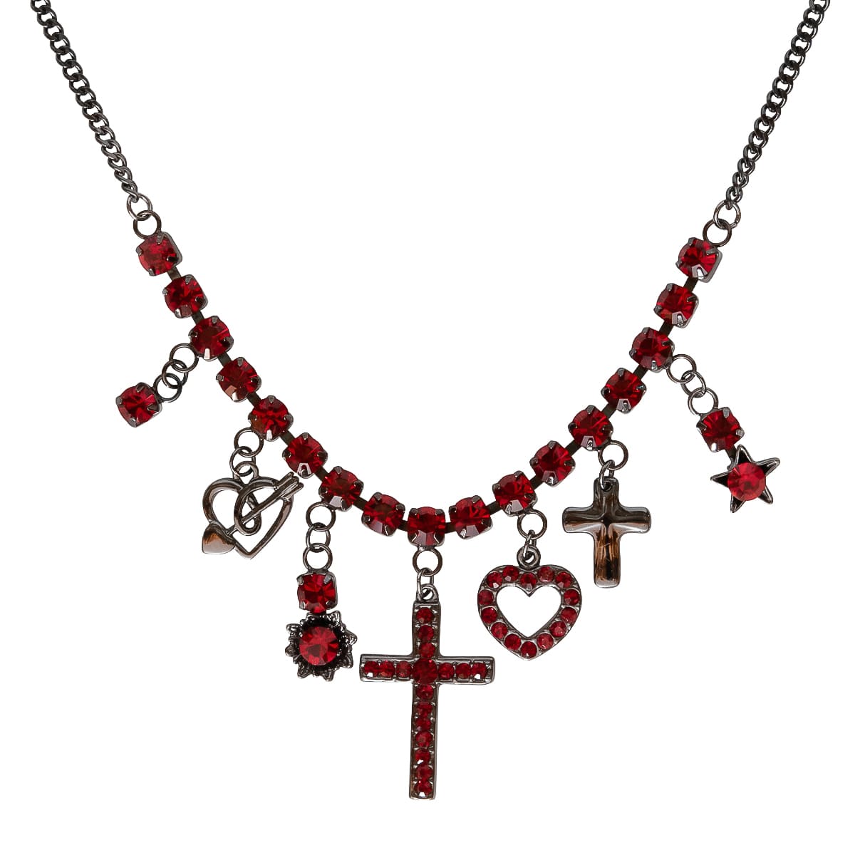 K.V. Fuchs Design Schmuck Damen Halskette in schwarz mit Anhängern Kreuz, Herz, Stern und Blume und Zirkonia in rot »K-3005«