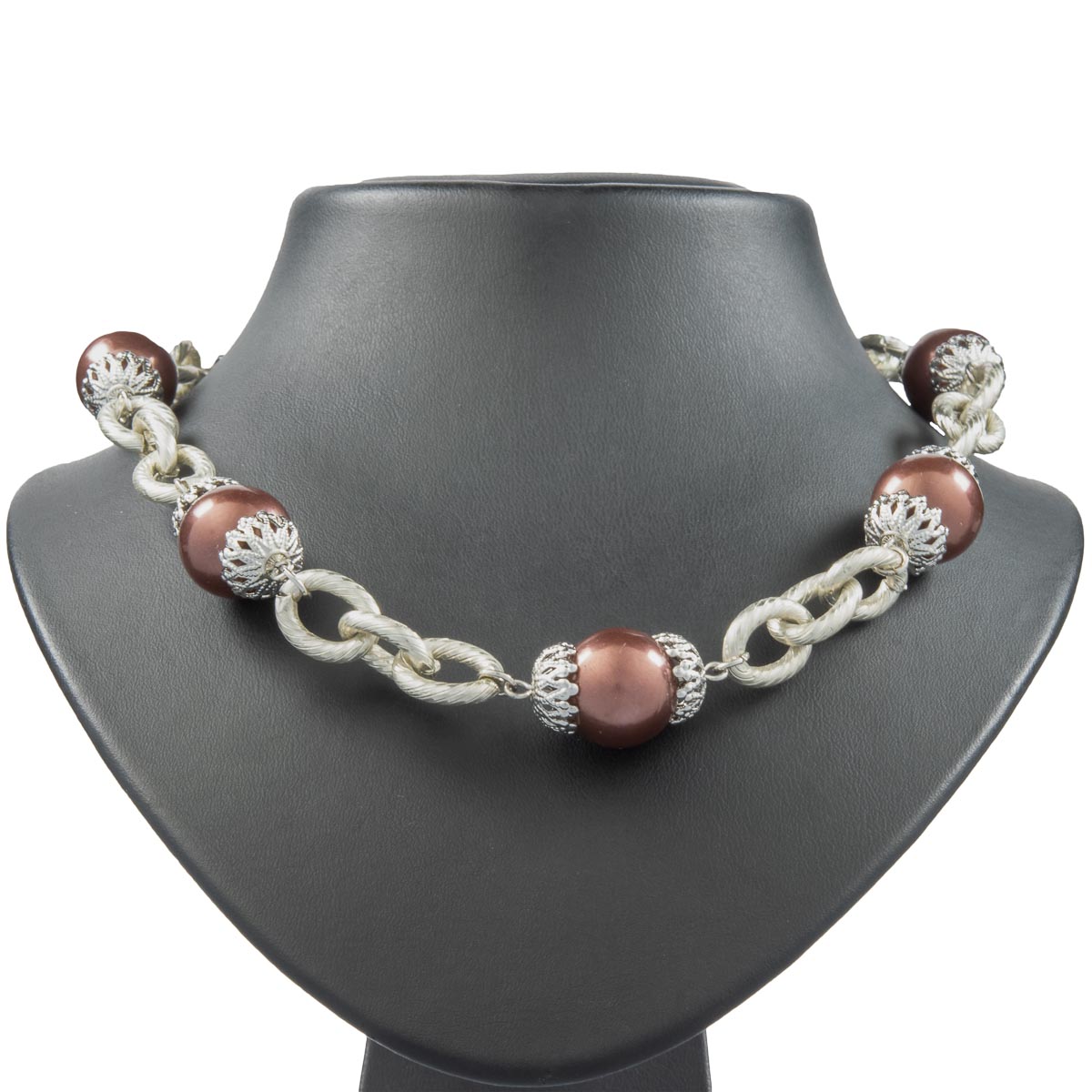 Eine grobe Ankerkette wechselt sich mit eleganten braunen Kugeln gekonnt ab. Die Kugeln werden von großen Fassungen begleitet. Durch ein Verlängerungskettchen kann die Kette individuell verlängert werden. Durch die Länge von 90 cm ideal für um einfarbige Outfits zu unterstützen.
