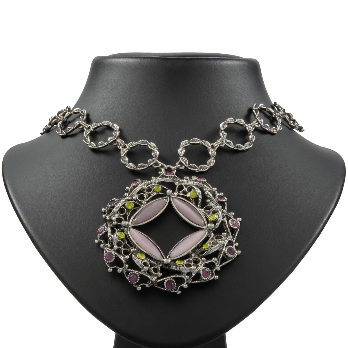 Fesch zum Dirndl und allen offenherzigen Outfits! Der große Anhänger wird von funkelnden Schmucksteinen in leuchtendem grün und violett perfekt unterstützt und lenkt die Blicke gekonnt auf Ihr Dekolleté. Die einzelnen Glieder der Kette sind liebevoll durch kleine, aneinandergereihte Blätter dargestellt.