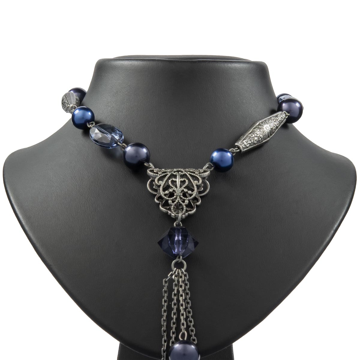 Ein schickes Schmuckstück im angesagten Vintage-Look. Blaue Kugeln wechseln sich mit verschiedenen Metall- und Kunststoffelementen in aufeinander abgestimmten Blautönen und antiksilberfarben gekonnt ab. Die liebevoll gestaltete Kette zeigt einen antiksilberfarbenen Anhänger mit Quaste. Überzeugt mit seiner elegant schicken Optik.