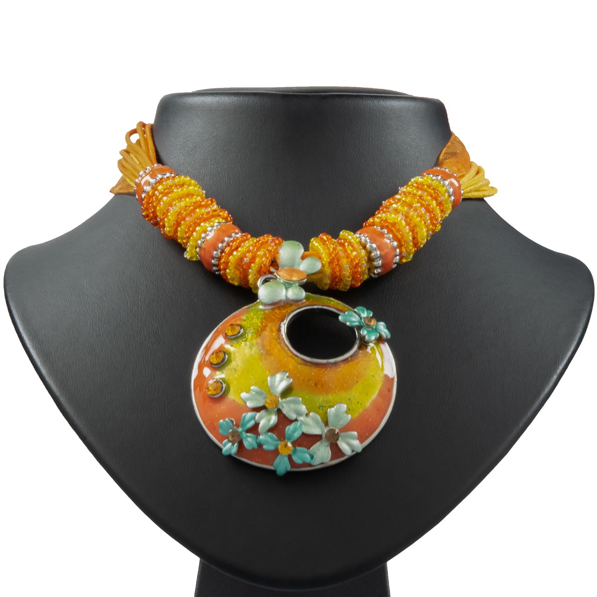 Ein schöner Begleiter für den Sommer! Der schicke Anhänger schimmert in orange und grün. Blüten in zwei Grüntönen werden von funkelnden orangefarbenen Schmucksteinen unterstützt. Ein grüner Schmetterling dient als Übergang zur Kette. Hier wurden gelbe und orangefarbene Schnüre mit Organzaband verbunden. Liebevoll gestaltete Zierringe begleiten die Kette und vollenden das gelungene Design.