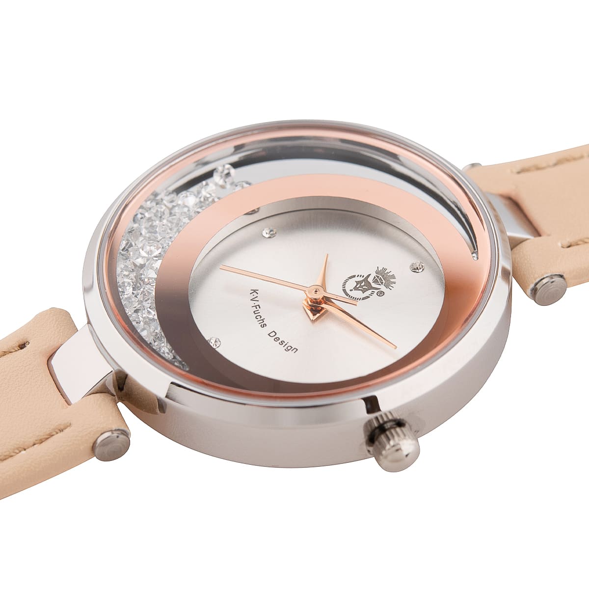 Ein schöner Hingucker - Das auffällig gestaltete Ziffernblatt zeigt als kleines Highlight funkelnde Schmucksteine, die im sichelförmigen Gehäuseteil frei beweglich sind. Die kupferfarbenen Zeiger werden vom farblich passenden Zierrand unterstützt. Vier funkelnde Schmucksteine als Stundenpunkte fügen sich harmonisch ins Gesamtbild. Das seitlich gesteppte beigefarbene Armband mit Dornschließe ergänzt das Design gekonnt. Punktet mit auffälligem Design!