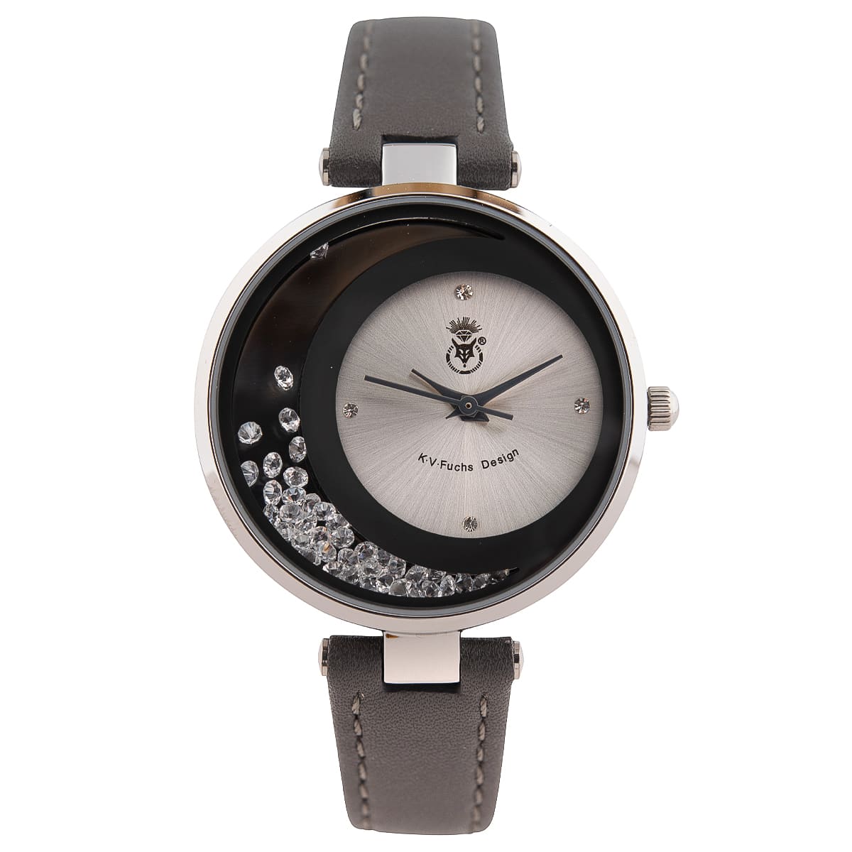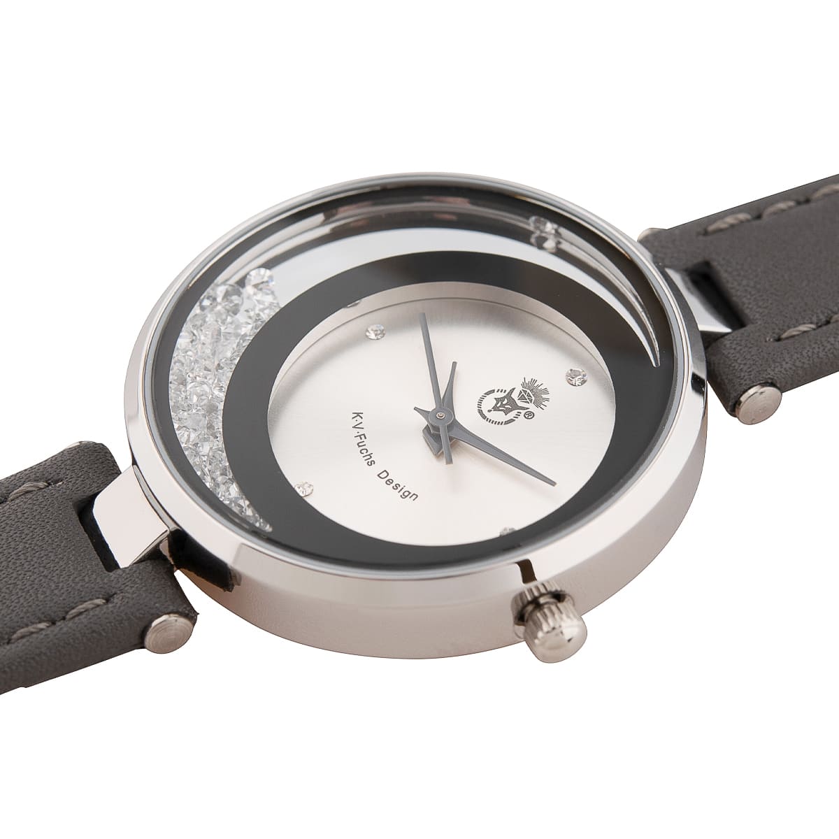 Ein schöner Hingucker - Das auffällig gestaltete Ziffernblatt zeigt als kleines Highlight funkelnde Schmucksteine, die im sichelförmigen Gehäuseteil frei beweglich sind. Die schwarzen Zeiger werden vom farblich passenden Zierrand unterstützt. Vier funkelnde Schmucksteine als Stundenpunkte fügen sich harmonisch ins Gesamtbild. Das seitlich gesteppte dunkelgraue Armband mit Dornschließe ergänzt das Design gekonnt. Punktet mit auffälligem Design!