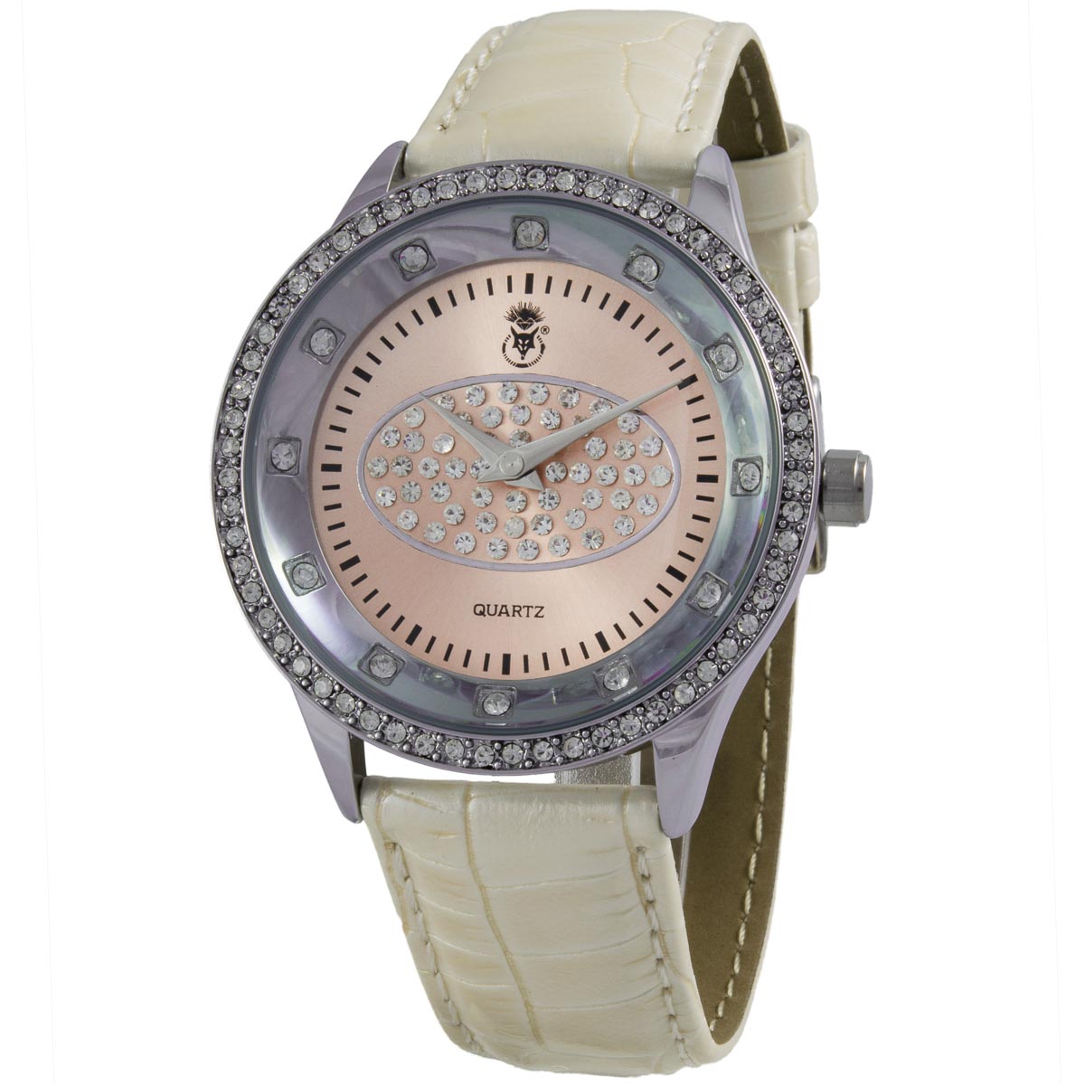 Funkelnde Schmucksteine prägen das Design der Uhr. Der Gehäuserand, die Stundenpunkte und die Insel in der Mitte des rotgoldenen Ziffernblatts glitzern um die Wette. Mit seinem weiß schimmernden Armband in Krokodil-Optik zaubert die Uhr Glamour aufs Handgelenk.