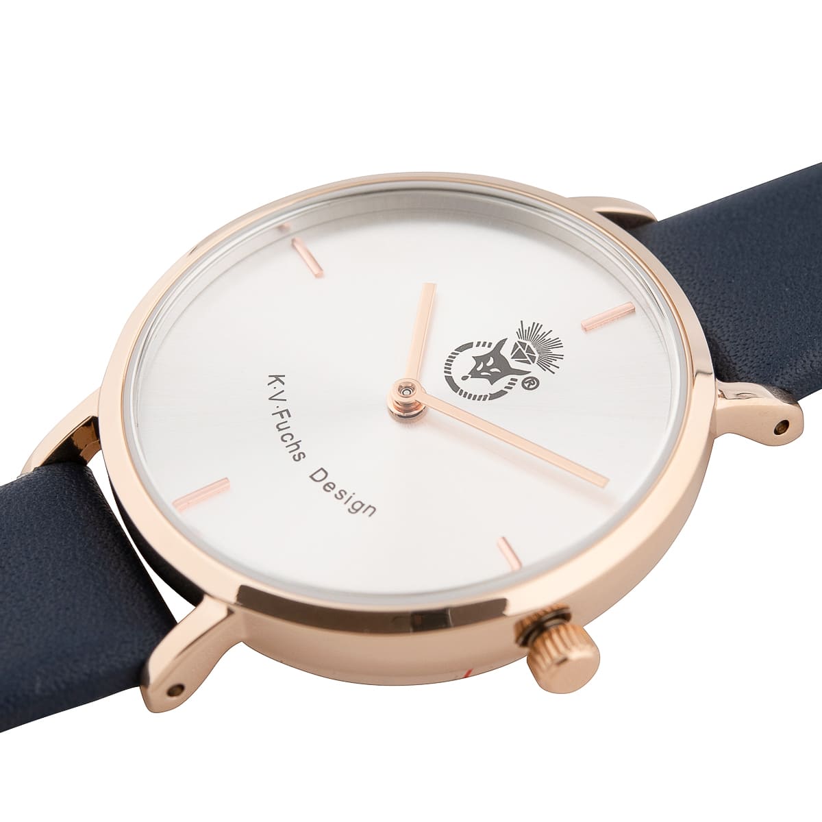 Ein echter Allrounder! Toll fürs Büro, zur Jeans und vielem mehr... Das IP-beschichtete rotgoldene Gehäuse harmonisiert zu dem hellen Ziffernblatt und dem dunkelblauen Armband mit Dornschließe. Zeiger und Index in Rotgold runden das Bild der Uhr perfekt ab. Das schlichte Design der Uhr passt zu jedem Anlass!