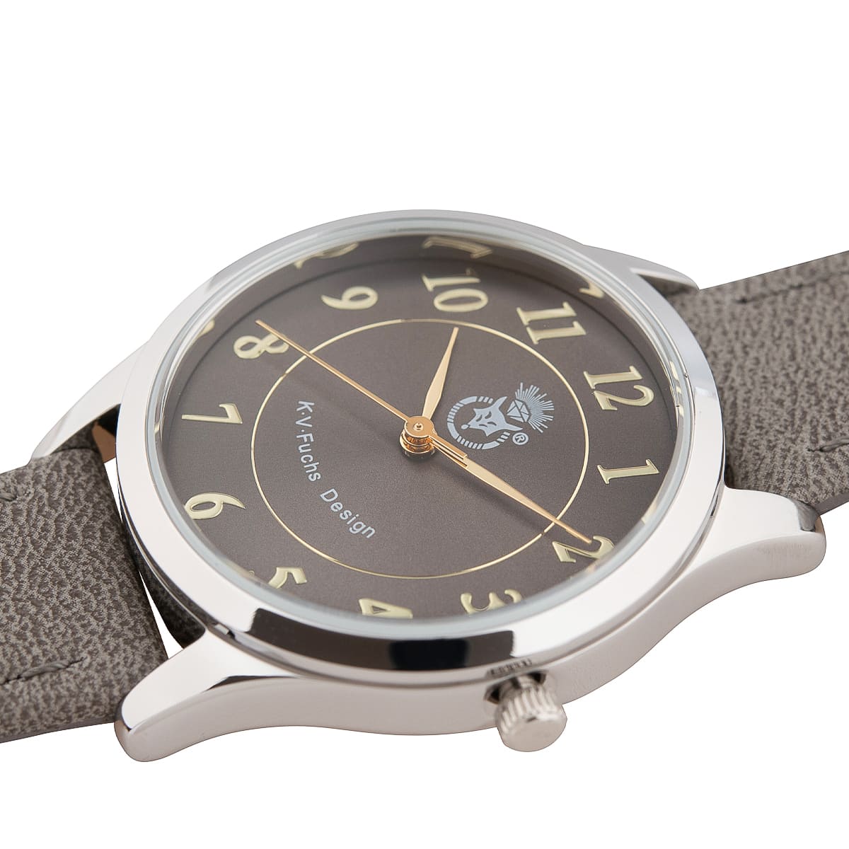 Wunderschöne Uhr im Vintage-Look! Die arabischen Zahlen und Zeiger in Gold lassen die Uhrzeit auf dem dunklen Ziffernblatt gut erkennen. Das silberfarbene Gehäuse passt perfekt zum dem grauen, gesteppten Armband mit Dornschließe. Ein gelungenes Design. Perfekt fürs Büro, auch zur Jeans ein toller Begleiter.