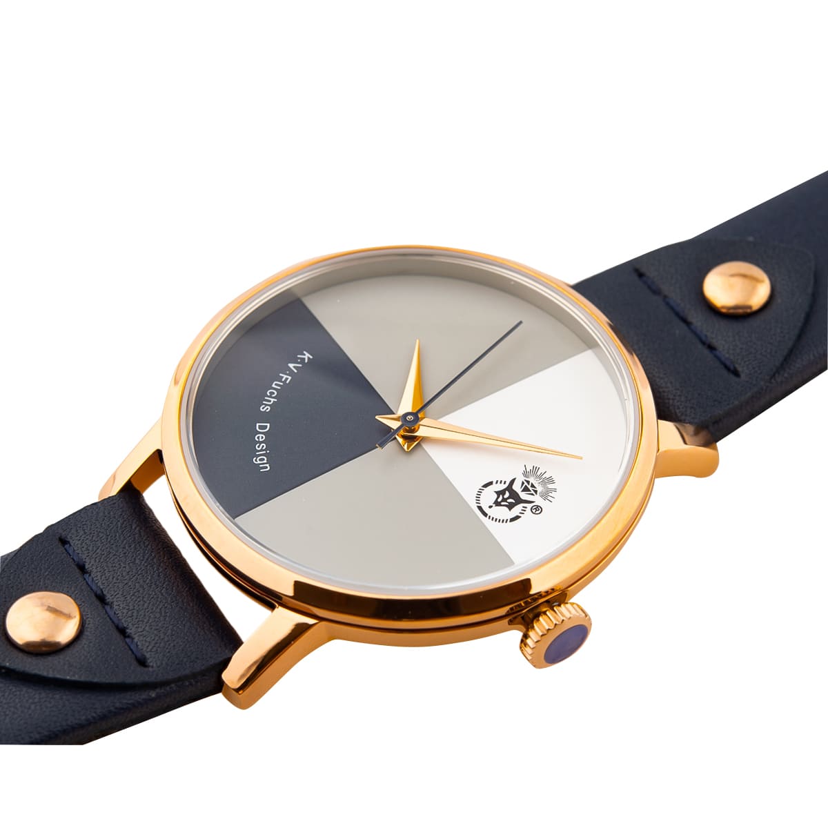Sportlicher Look, der Blicke auf sich zieht. Das auffällig gestaltete Ziffernblatt zeigt klar getrennte Viertel in grau, blau und weiß, gekonnt begleitet von rotgoldenen Zeigern. Ein dunkelblaues Armband mit rotgoldenen Ziernieten harmonisiert perfekt zu dem rotgoldenen Gehäuse und der passenden Dornschließe. Eine rundum gelungene Farbkombination.