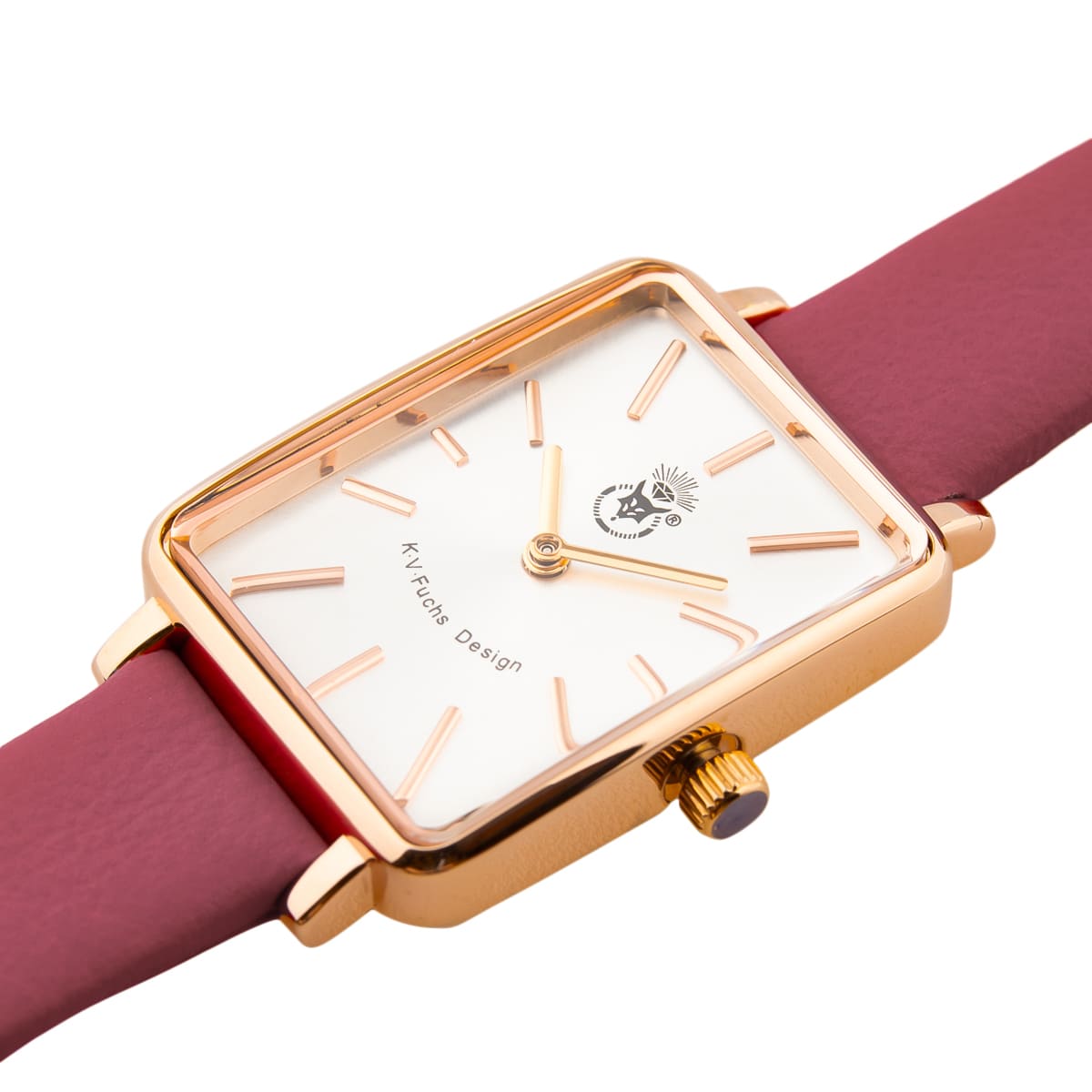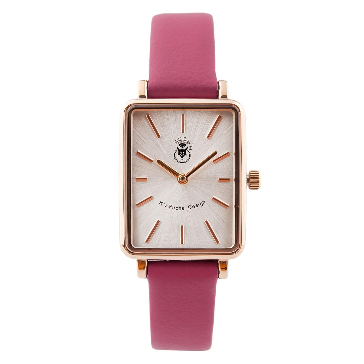 Retrocharme - Das zeitlos elegante Design der eher kleinen rechteckigen Uhr wird durch das schlichte Ziffernblatt in Pink unterstrichen. Kombiniert mit dem rotgoldenen Gehäuse unterstreichen die rotgoldenen Zeiger und Stundenpunkte die geschmackvolle Optik. Das schmale pinkfarbene Armband passt farblich perfekt zum Ziffernblatt und vervollständigt die Uhr gekonnt. Zeitlos schön.