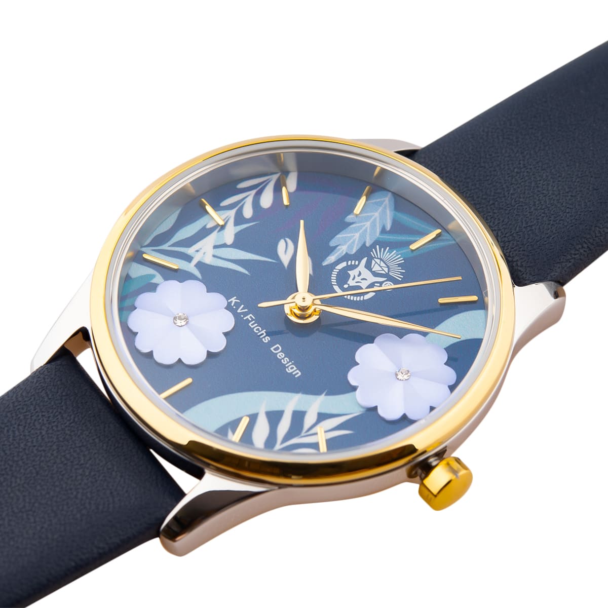 Verspielter Eyecatcher - Die wunderschöne Uhr mit floralem Muster am Ziffernblatt unterstreicht den femininen Look gekonnt. Stundenpunkte und Zeiger in edlem Rotgold zeigen sich passend zum Gehäuse. Das blaue Armband greift den Farbspiegel des Ziffernblatts gekonnt auf und macht die Uhr zu einem echten Schmuckstück. Vielfältig zu kombinieren.