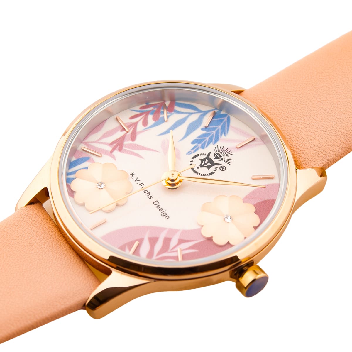 Verspielter Eyecatcher - Die wunderschöne Uhr mit floralem Muster am Ziffernblatt unterstreicht den femininen Look gekonnt. Stundenpunkte und Zeiger in edlem Rotgold zeigen sich passend zum Gehäuse. Das rosefarbene Armband greift den Farbspiegel des Ziffernblatts gekonnt auf und macht die Uhr zu einem echten Schmuckstück. Vielfältig zu kombinieren.