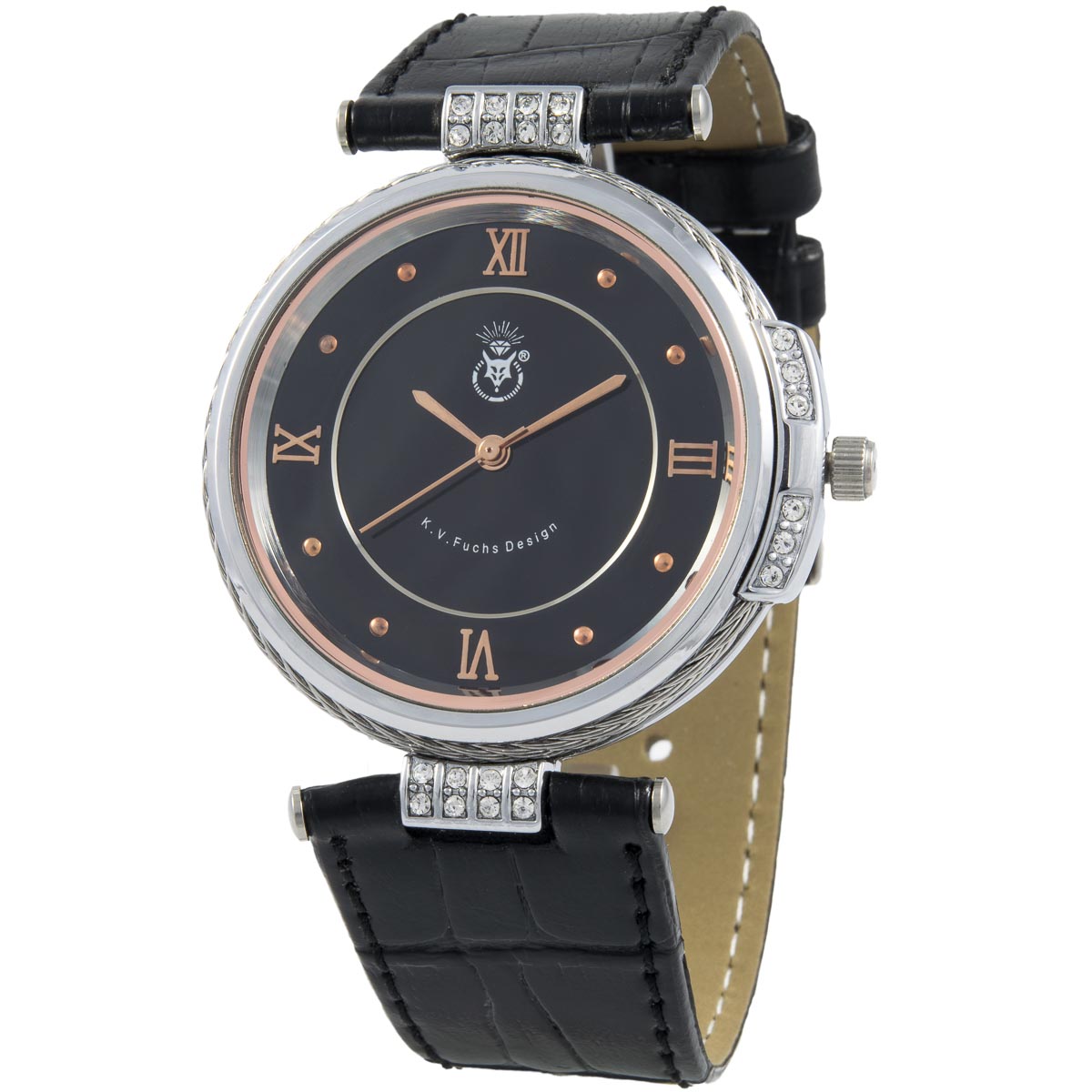 Das Gehäuse mit Kordeldruck lässt die Uhr im maritimen Look strahlen. Die eingearbeiteten Schmucksteine unterstützen das Design. Das schwarze Ziffernblatt wird von schmalen Zeigern und einem Index in Rotgold begleitet. Mit seinem schwarzen Armband mit Dornschließe wird die Uhr zum schicken Begleiter.