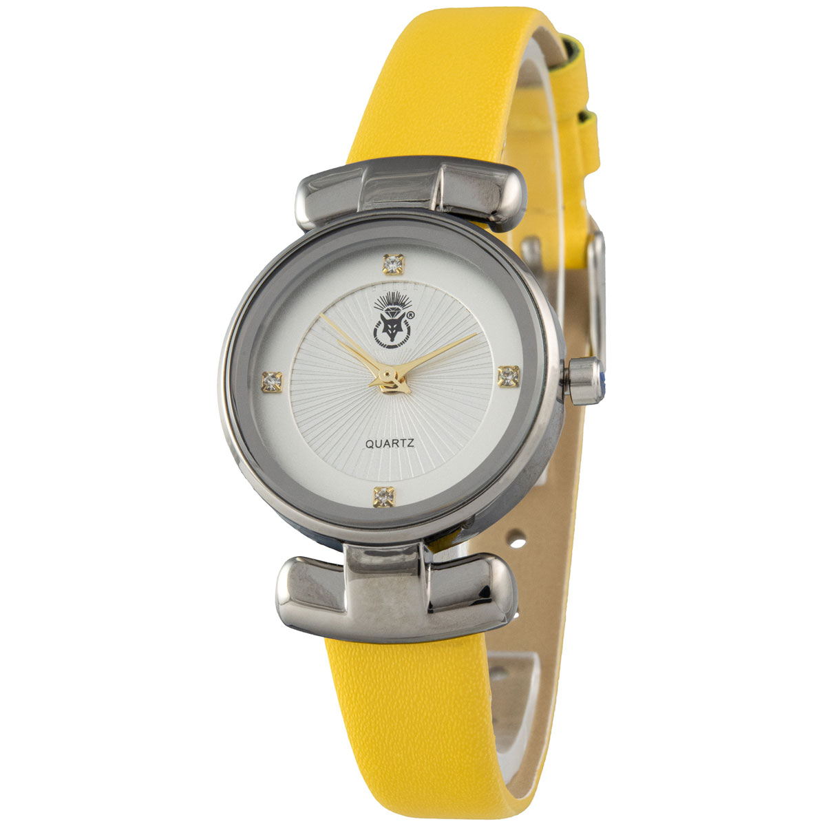 Das gelbe Armband mit Dornschließe macht die Uhr zu einem schönen Begleiter für den Sommer. Die Sonnenstrahlen werden auf dem weißen Ziffernblatt wiedergegeben. Unterstützt wird die sonnige Optik von goldenen Zeigern und 4 Schmucksteinen, die als Stundenpunkte dienen.