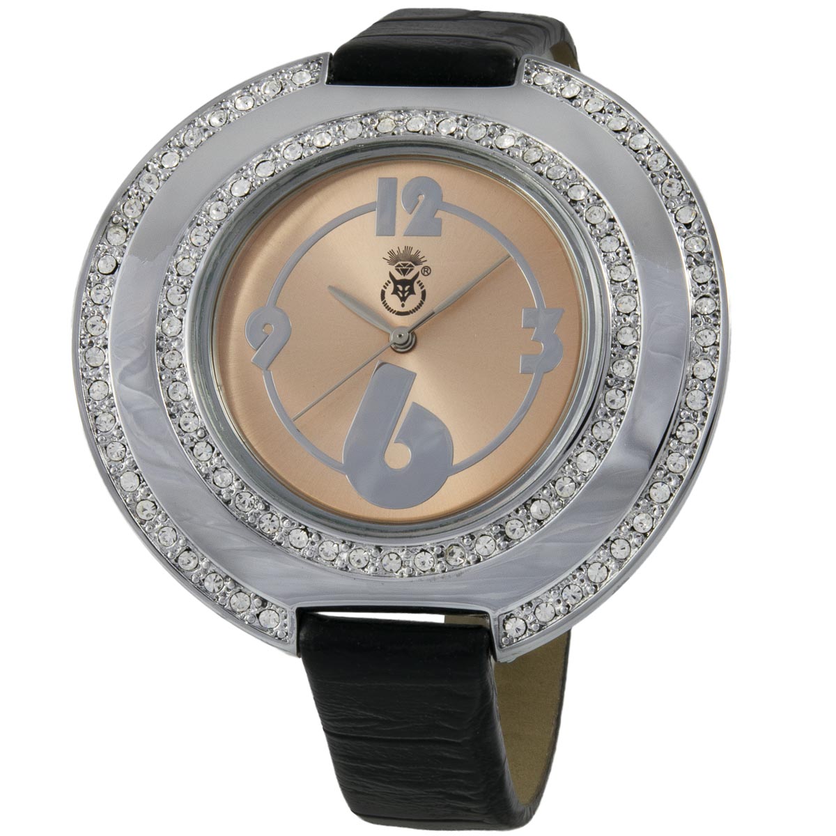 Ein echter Blickfang. Das auffällige Gehäuse ist von zwei Reihen funkelnden Schmucksteinen besetzt. Durch die leichte Wölbung passt sich das großzügige Gehäuse am Arm an. Silberfarbene Zeiger und verschieden große Zahlen unterstreichen auf dem goldschimmernden Ziffernblatt die verspielte Note. Ein schwarzes Armband macht die Uhr zum täglichen Begleiter.