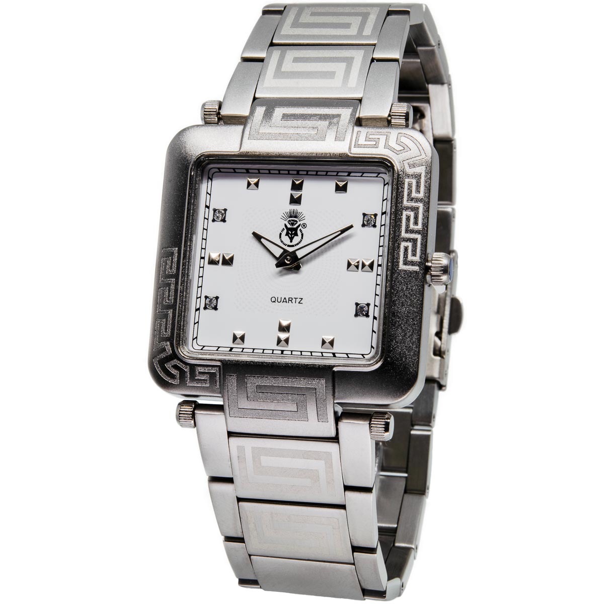 Dieses Design fällt durch sein ägyptisches Muster sofort ins Auge. Das formschöne Gehäuse wird von einem Mäander Ornament geschmückt. Das ebenfalls matt gebürstete, silberfarbene Glieder-Armband mit Klappschließe nimmt die Prägung mit auf. Das weiße Ziffernblatt zeigt einen pyramidenförmigen Index und vier funkelnden Schmucksteine. Mit dieser Uhr setzen Sie Akzente.