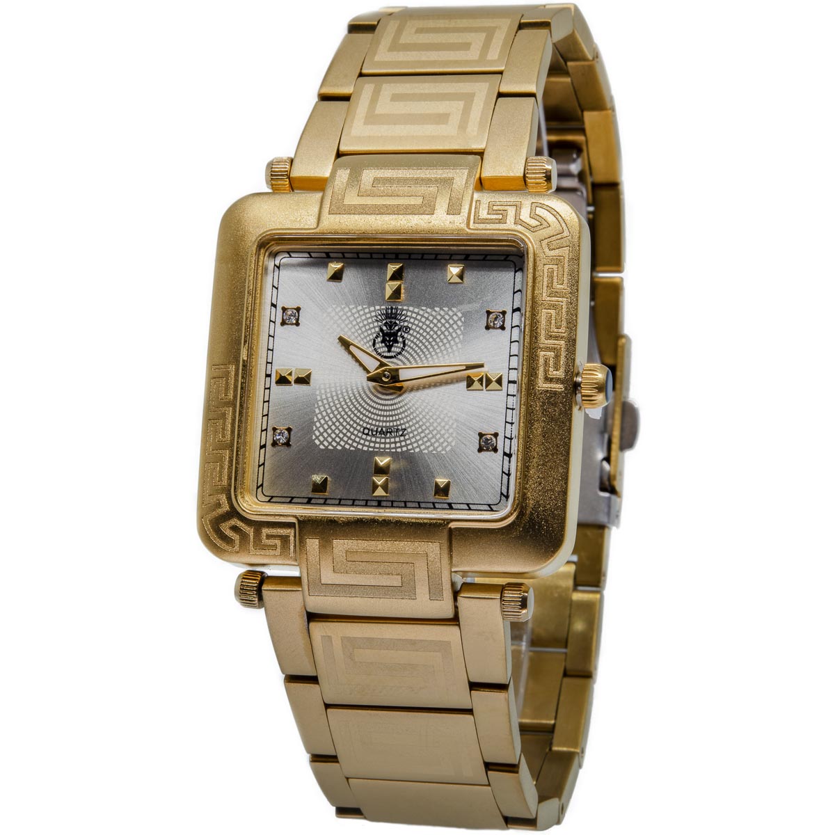 Dieses Design fällt durch sein ägyptisches Muster sofort ins Auge. Das formschöne Gehäuse wird von einem Mäander Ornament geschmückt. Das ebenfalls matt gebürstete, goldfarben Glieder-Armband mit Klappschließe nimmt die Prägung mit auf. Das silber glänzende Ziffernblatt zeigt einen pyramidenförmigen Index und vier funkelnden Schmucksteine. Mit dieser Uhr setzen Sie Akzente.
