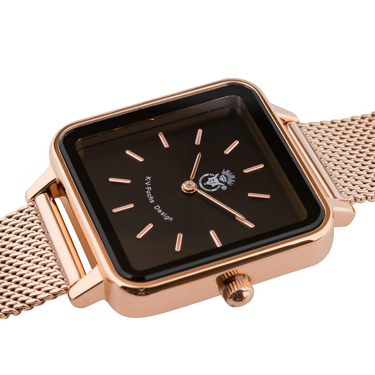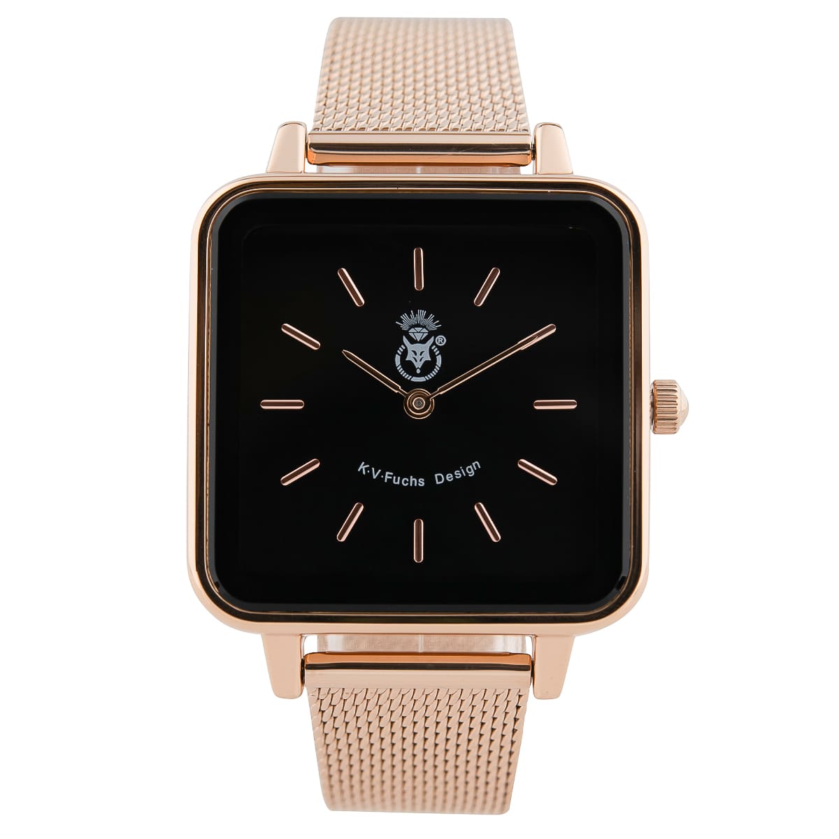 leicht - lässig - sportlich. Das moderne, quadratische Design der Quarzuhr wird an einem edlen Milanaise-Armband getragen. Index und Zeiger in Rotgold sorgen für die gute Ablesbarkeit und dient als Farbkontrast auf dem schwarzen Ziffernblatt. Armband und Gehäuse in trendigem Rotgold runden das gelungene Design perfekt ab. Durch den verstellbaren Klappverschluss ist ein einfaches und individuelles Anpassen des Armbands kein Problem. Stilvoller Begleiter für formelle und lässige Garderobe.