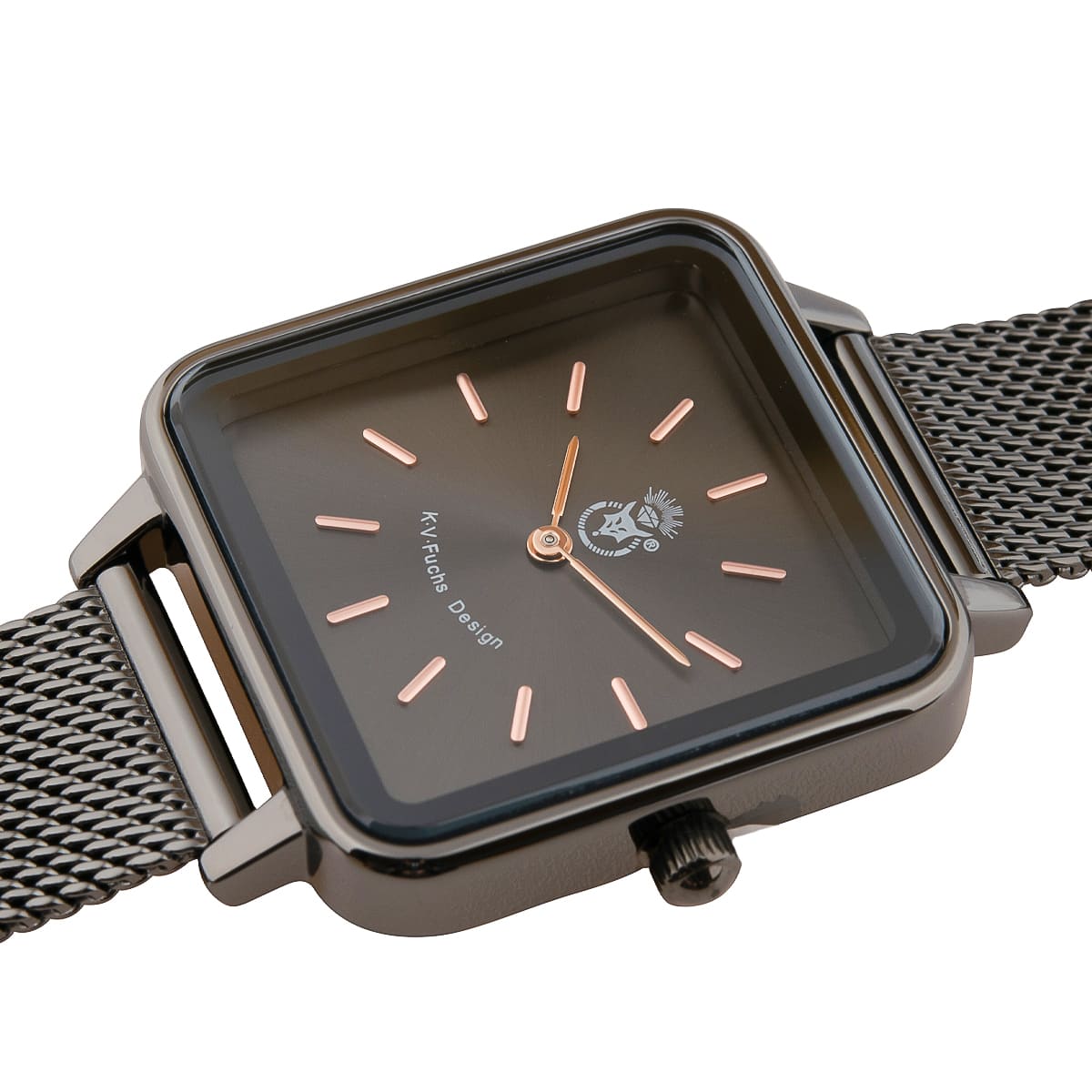 leicht - lässig - sportlich. Das moderne, quadratische Design der Quarzuhr wird an einem edlen Milanaise-Armband getragen. Index und Zeiger in Rotgold sorgen für die gute Ablesbarkeit und dient als Farbkontrast der komplett in Schwarz gehaltenen Uhr. Durch den verstellbaren Klappverschluss ist ein einfaches und individuelles Anpassen des Armbands kein Problem. Stilvoller Begleiter für formelle und lässige Garderobe.