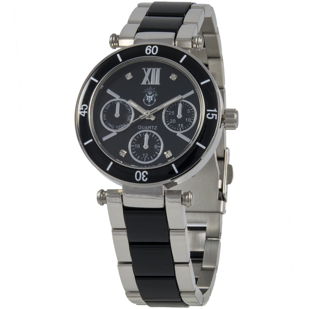 Ein toller Begleiter für jeden Tag. Ein schwarzer Rand mit Index prägt den Gehäuserand. Das schwarze Ziffernblatt erscheint in Chronographen-Optik. Die Anzeigen, der Index und die Zeiger in Silber werden von vier funkelnden Schmucksteinen vervollständigt. Die Kombination von schwarzem Keramik-Gliederarmband mit silbernem Rand greift das Farbkonzept perfekt auf. Ein sicheres Befestigen und Abnehmen der Uhr wird durch die einfache Faltschließe ermöglicht. Elegant mit schicker Optik.