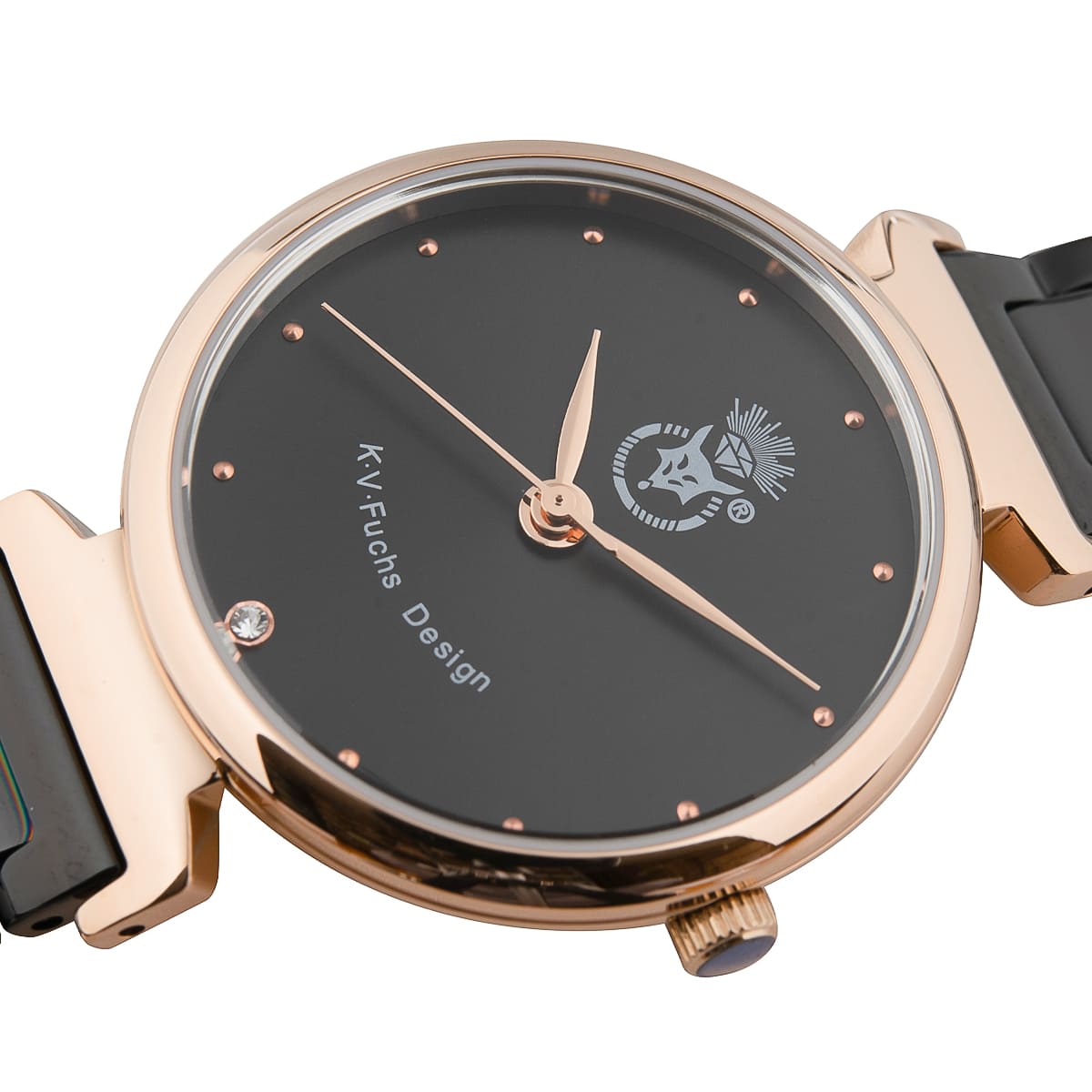 Stilvolle Damenuhr in zeitloser Optik. Das IP-beschichtete rotgoldene Gehäuse zeigt ein schwarzes Ziffernblatt mit rotgoldenem Index und schlanken Zeigern. Als Blickfang strahlt ein funkelnder Schmuckstein als Stundenpunkt. Das schwarze Glieder-Armband mit praktischer Faltschließe rundet das gelungene Design gekonnt ab. Ein echtes Must-have!