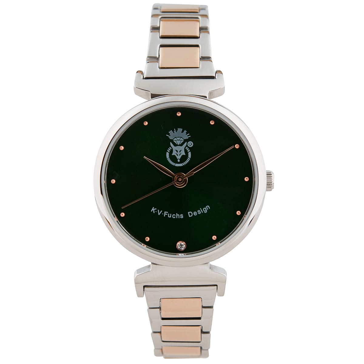 Stilvolle Damenuhr in zeitloser Optik. Das polierte Metall-Gehäuse zeigt ein grünes Ziffernblatt mit rotgoldenem Index und schlanken Zeigern. Als Blickfang strahlt ein funkelnder Schmuckstein als Stundenpunkt. Das Glieder-Armband mit praktischer Faltschließe in klassischer Kombination von Rotgold und Silber rundet das gelungene Design gekonnt ab. Ein echtes Must-have!