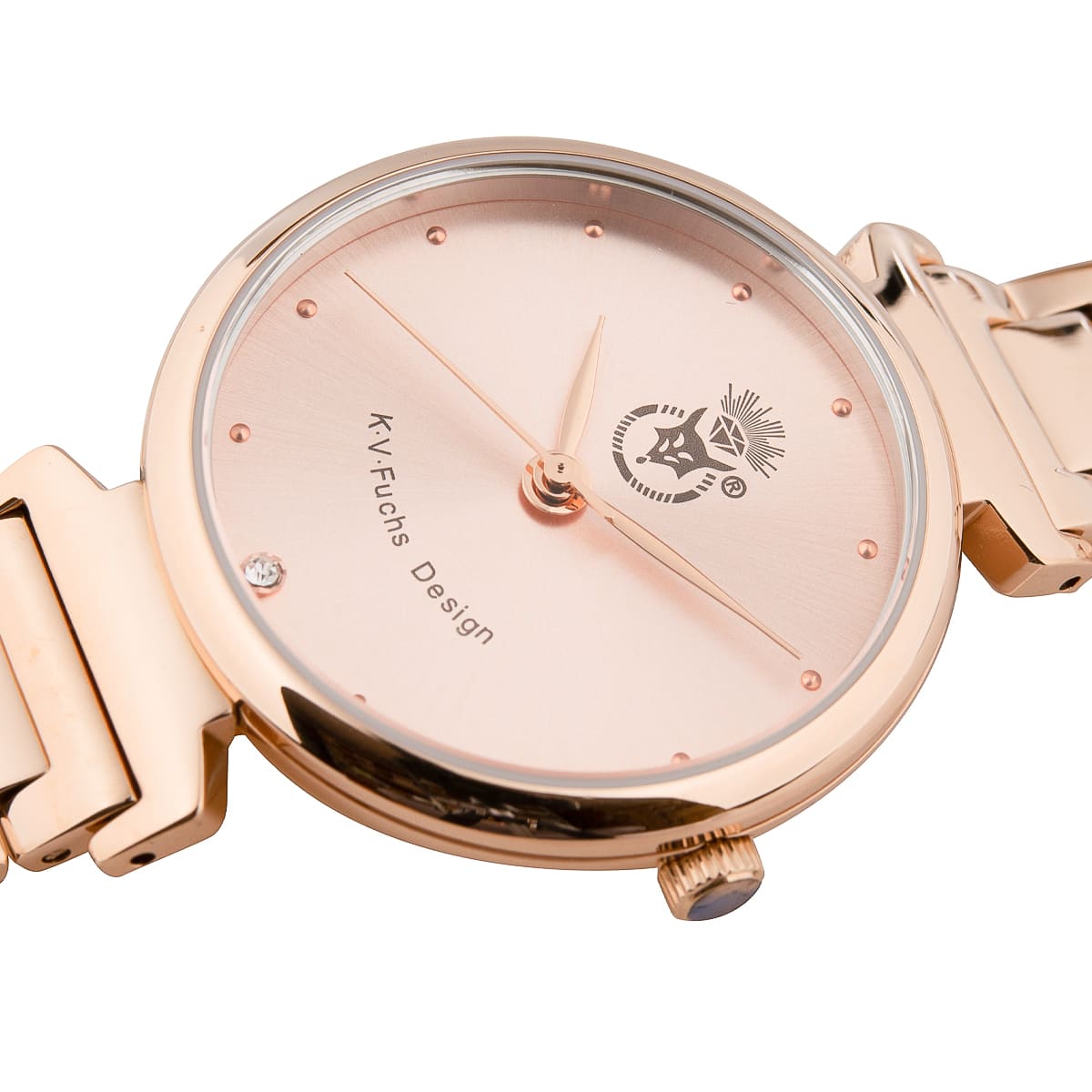 Stilvolle Damenuhr in zeitloser Optik. Das rotgoldene IP-beschichtete Gehäuse zeigt ein rosafarbenes Ziffernblatt mit rotgoldenem Index und schlanken Zeigern. Als Blickfang strahlt ein funkelnder Schmuckstein als Stundenpunkt. Das rotgoldene Glieder-Armband mit praktischer Faltschließe rundet das gelungene Design gekonnt ab. Ein echtes Must-have!