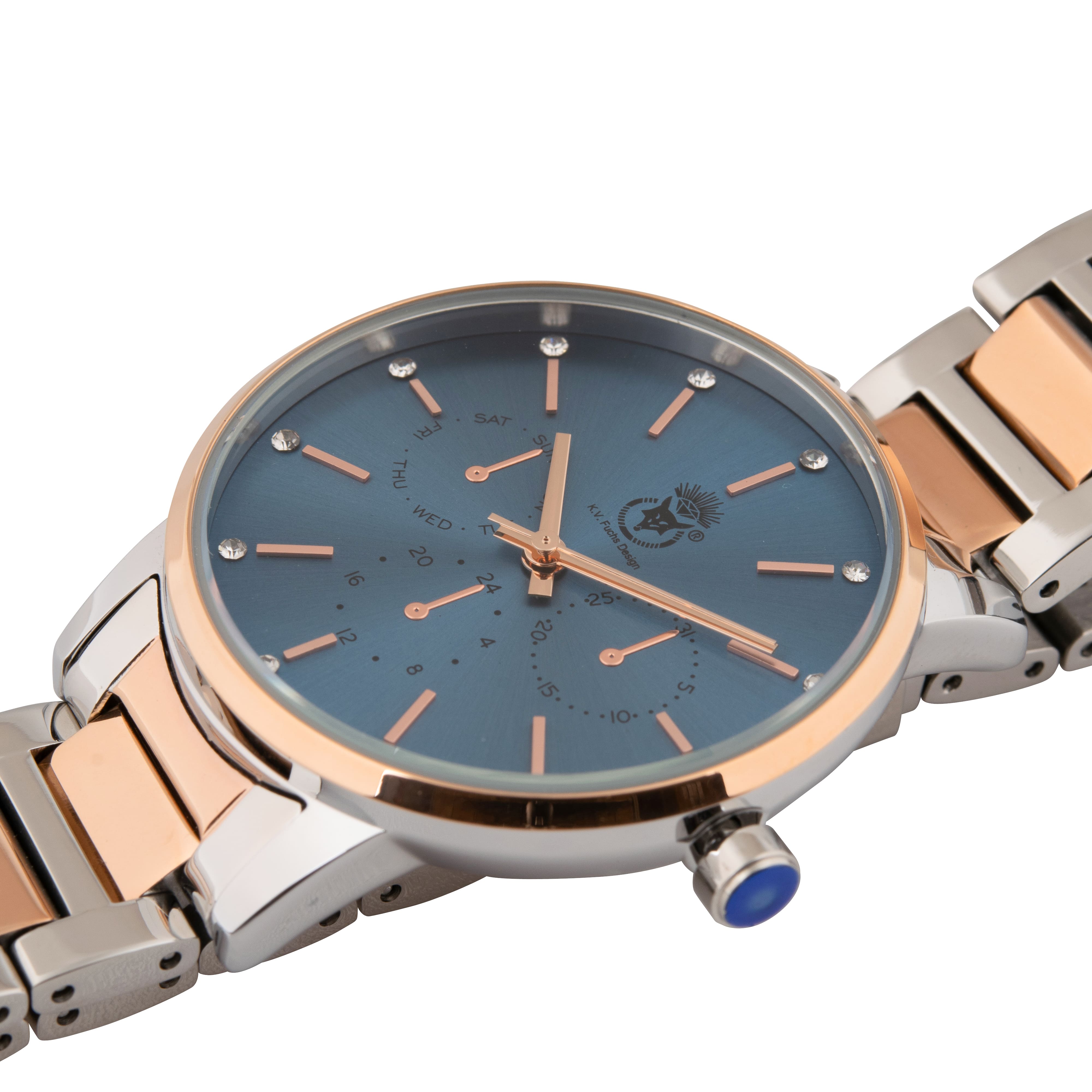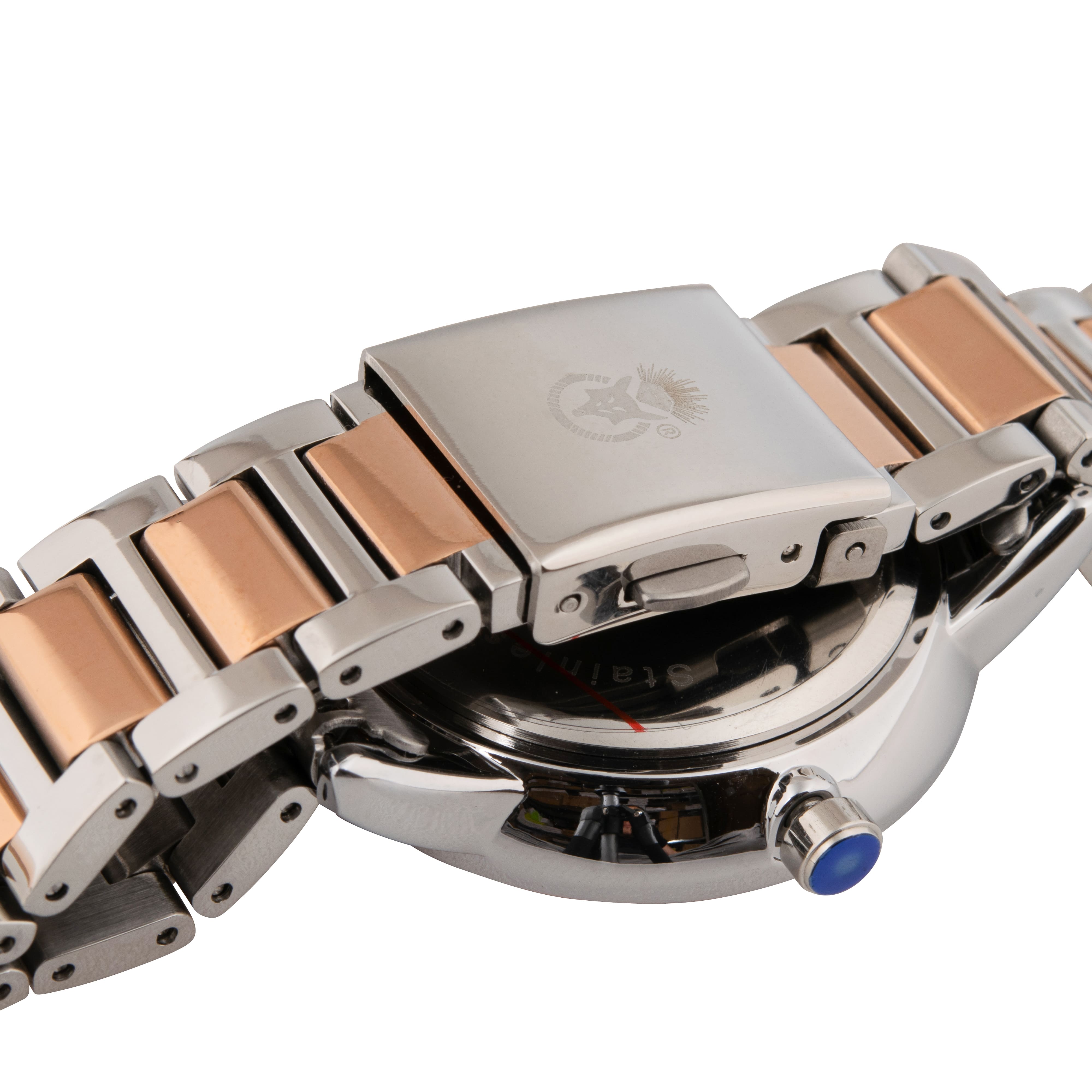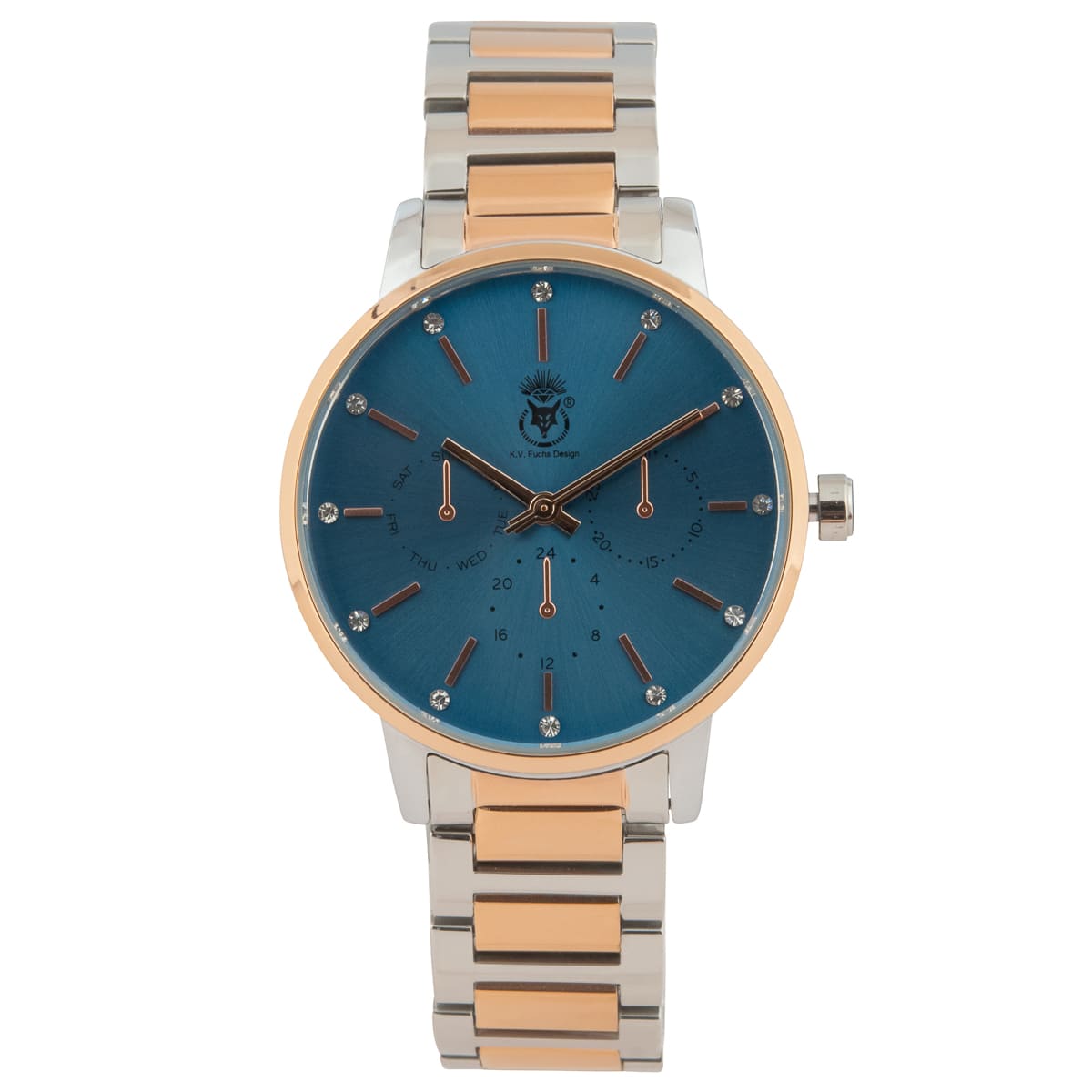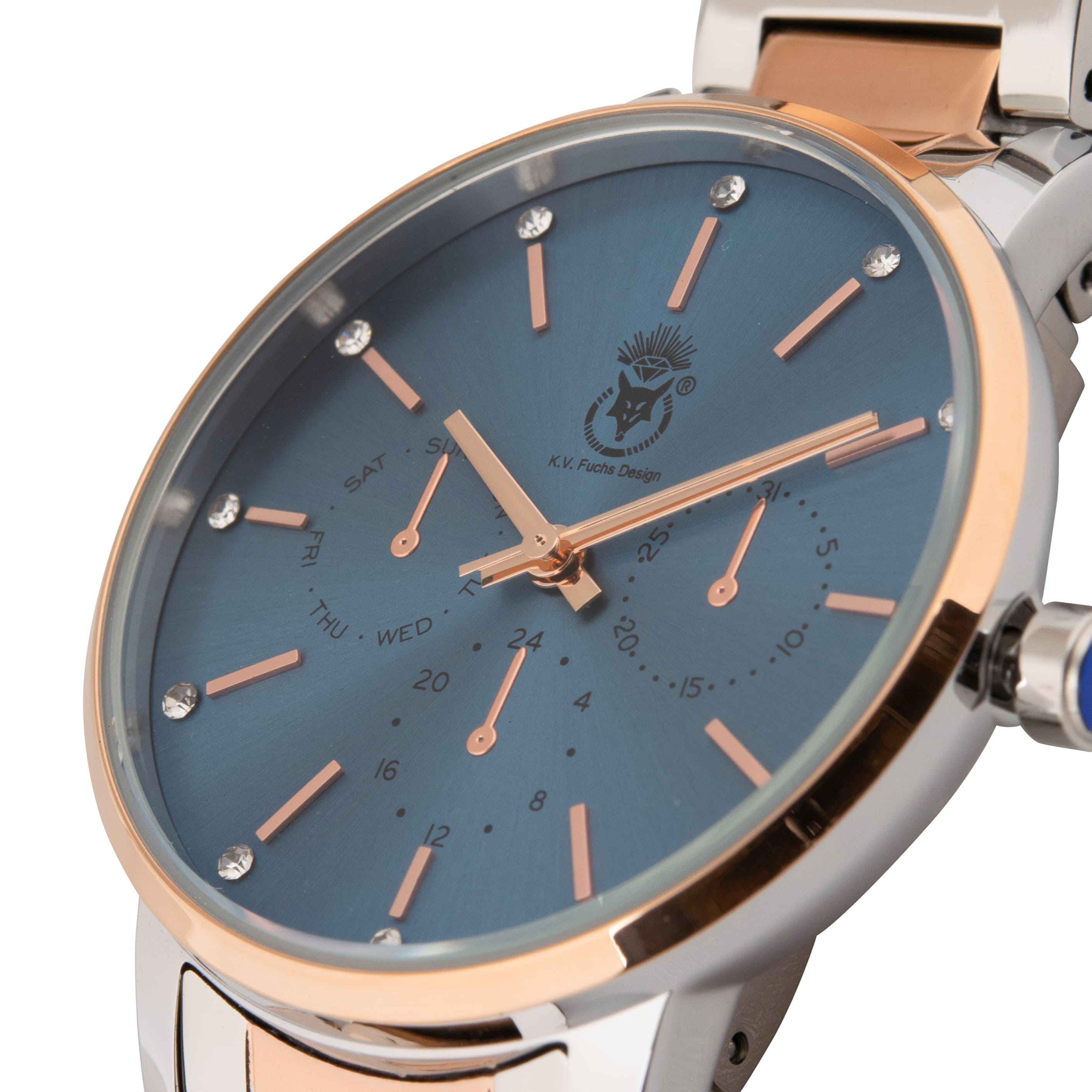 Unterstreicht den sportlich, eleganten Look. Das rotgoldfarbene IP-beschichtete Metall-Gehäuse wird von einem bicolor IP-beschichtenem Edelstahl-Armband begleitet. Die einfache Faltschließe sorgt für ein bequemes Befestigen und abnehmen der Uhr. Das blaue Ziffernblatt erscheint in Chronographen-Optik und wird von den rotgoldfarbenen Anzeigen, dem Index und den Zeiger gekonnt in Szene gesetzt. Ein schöner Begleiter für jeden Tag.