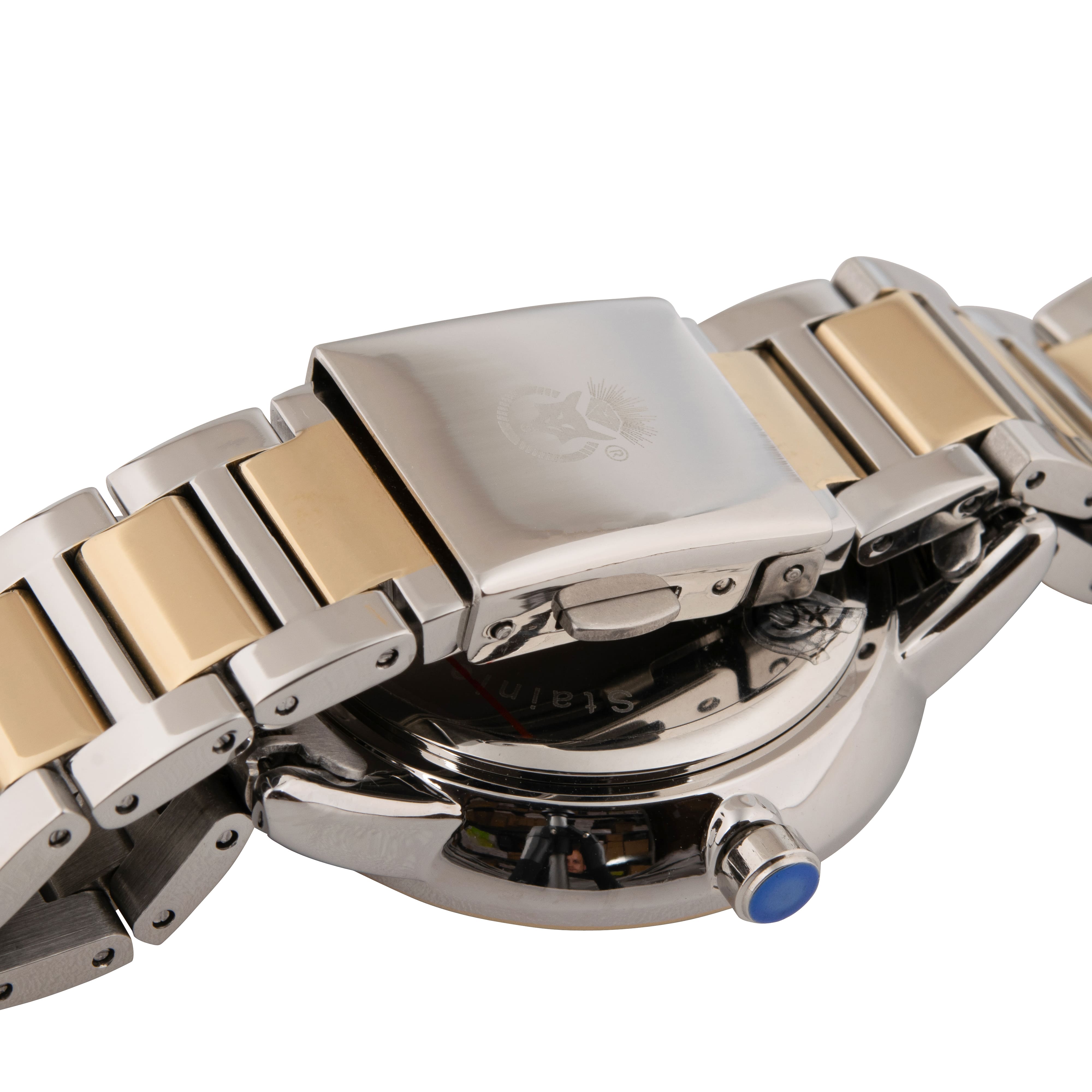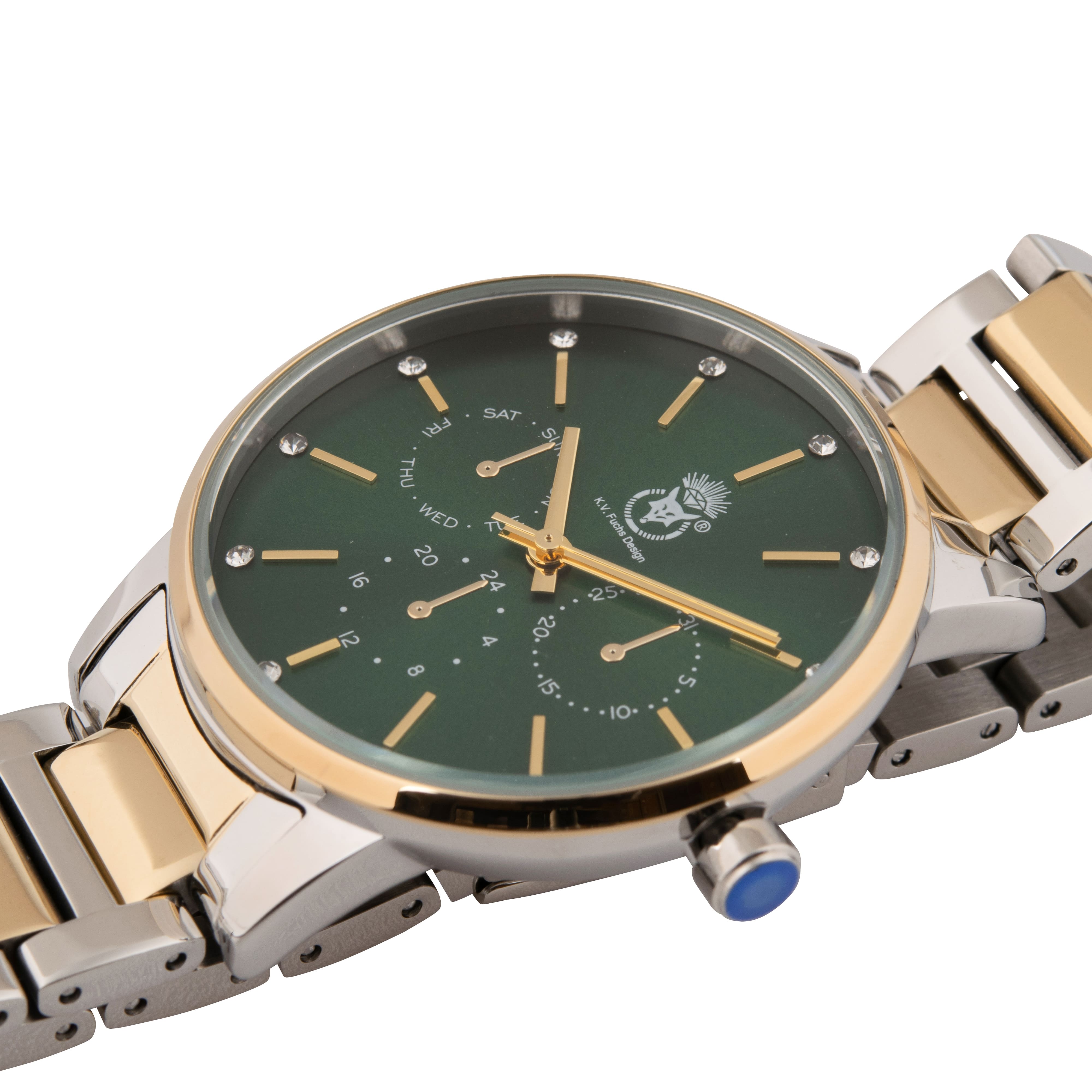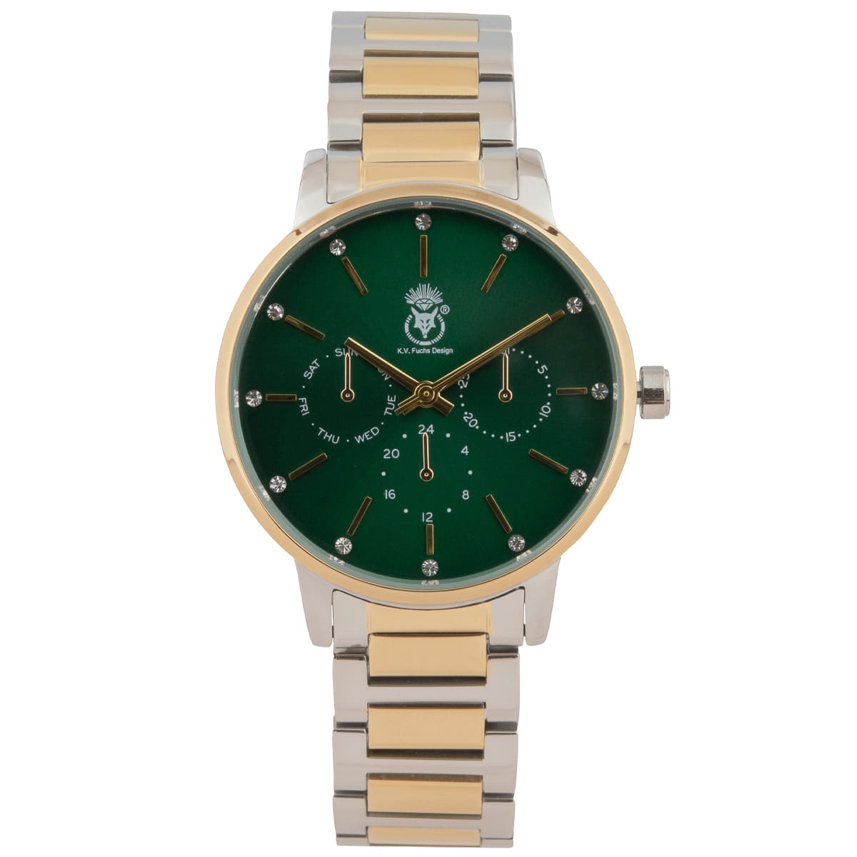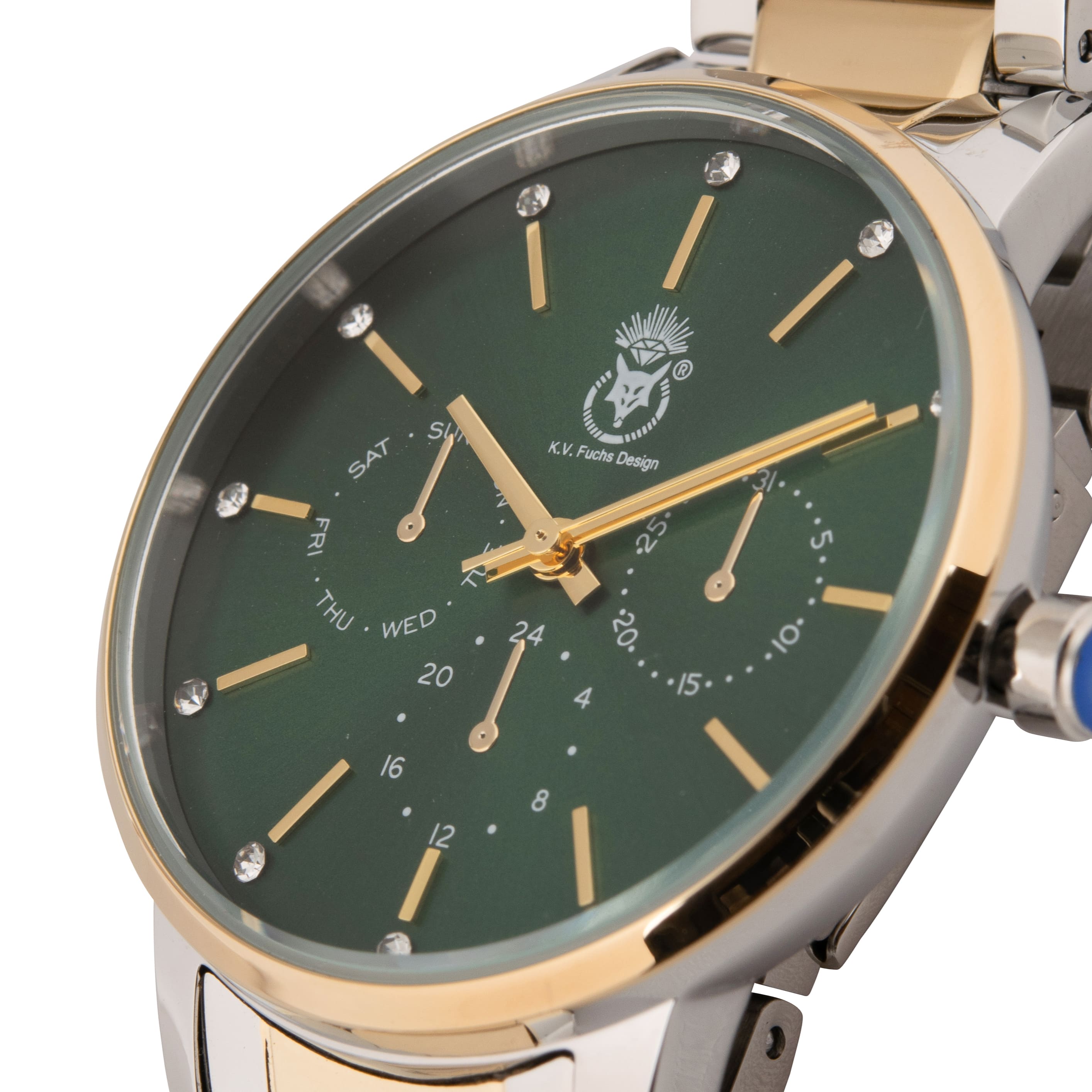 Unterstreicht den sportlich, eleganten Look. Das goldfarbene IP-beschichtete Metall-Gehäuse wird von einem bicolor IP-beschichtenem Edelstahl-Armband begleitet. Die einfache Faltschließe sorgt für ein bequemes Befestigen und abnehmen der Uhr. Das grüne Ziffernblatt erscheint in Chronographen-Optik und wird von den goldfarbenen Anzeigen, dem Index und den Zeiger gekonnt in Szene gesetzt. Ein schöner Begleiter für jeden Tag.