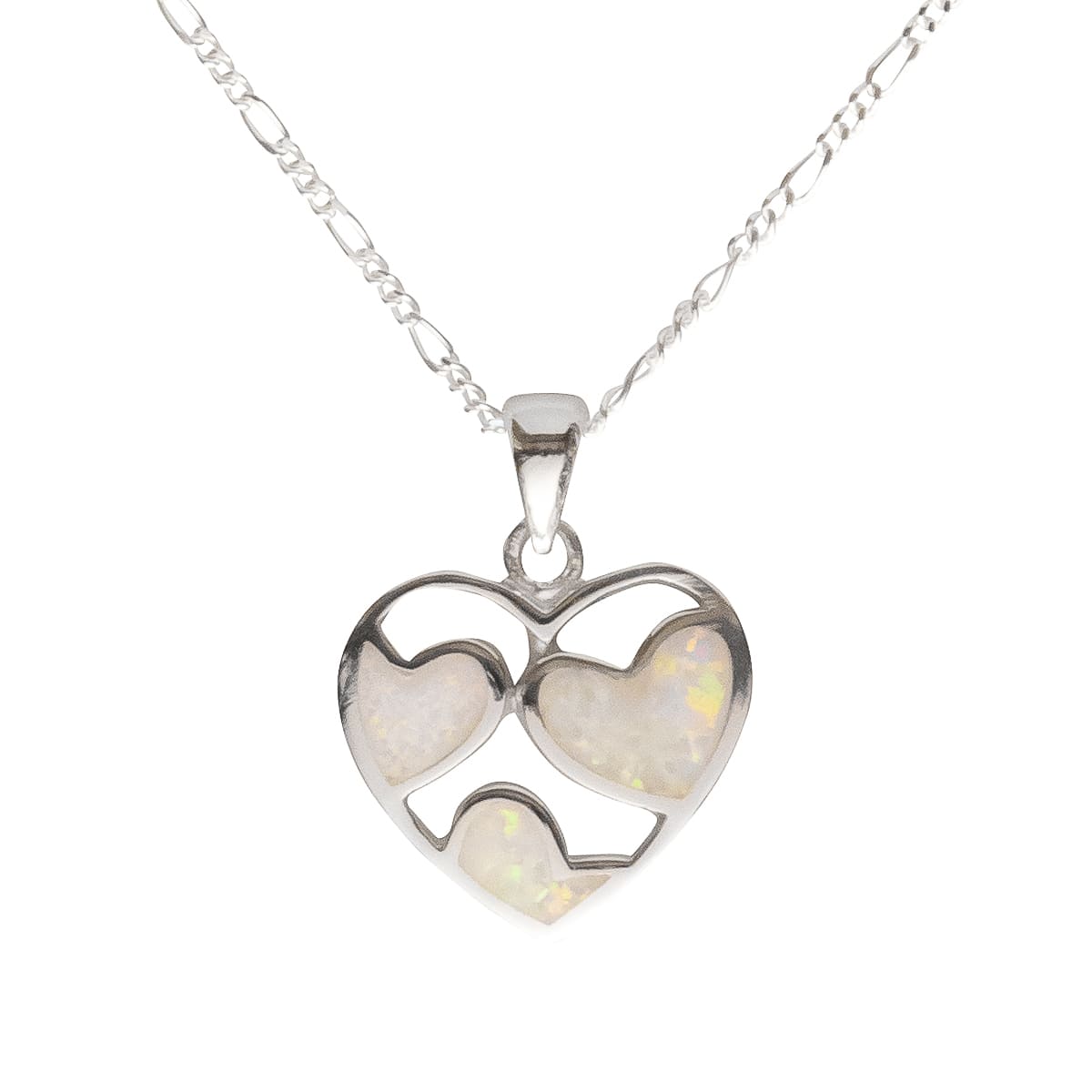 Das Herz als ultimatives Zeichen der Liebe ist auch bei unseren 925 Silberanhängern nicht wegzudenken. Gleich drei Herzen aus schimmerndem weißen Recon-Opal werden in einem Anhänger gekonnt in Szene gesetzt. Die 45 cm lange Figarokette macht das Schmuckstück komplett. Am schönsten schenkt man mit Herz.