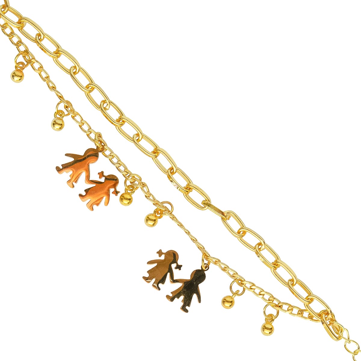 Süßes Accessoire. Die doppelte goldfarbene Ankerkette als schickes Bettelarmband. Zwei liebevoll gestaltete Anhänger als Best Friends werden von kleinen goldenen Kugeln unterstützt. Durch das Verlängerungskettchen individuell verstellbar. Ein schöner Blickfang. Machen Sie sich oder anderen eine Freude!