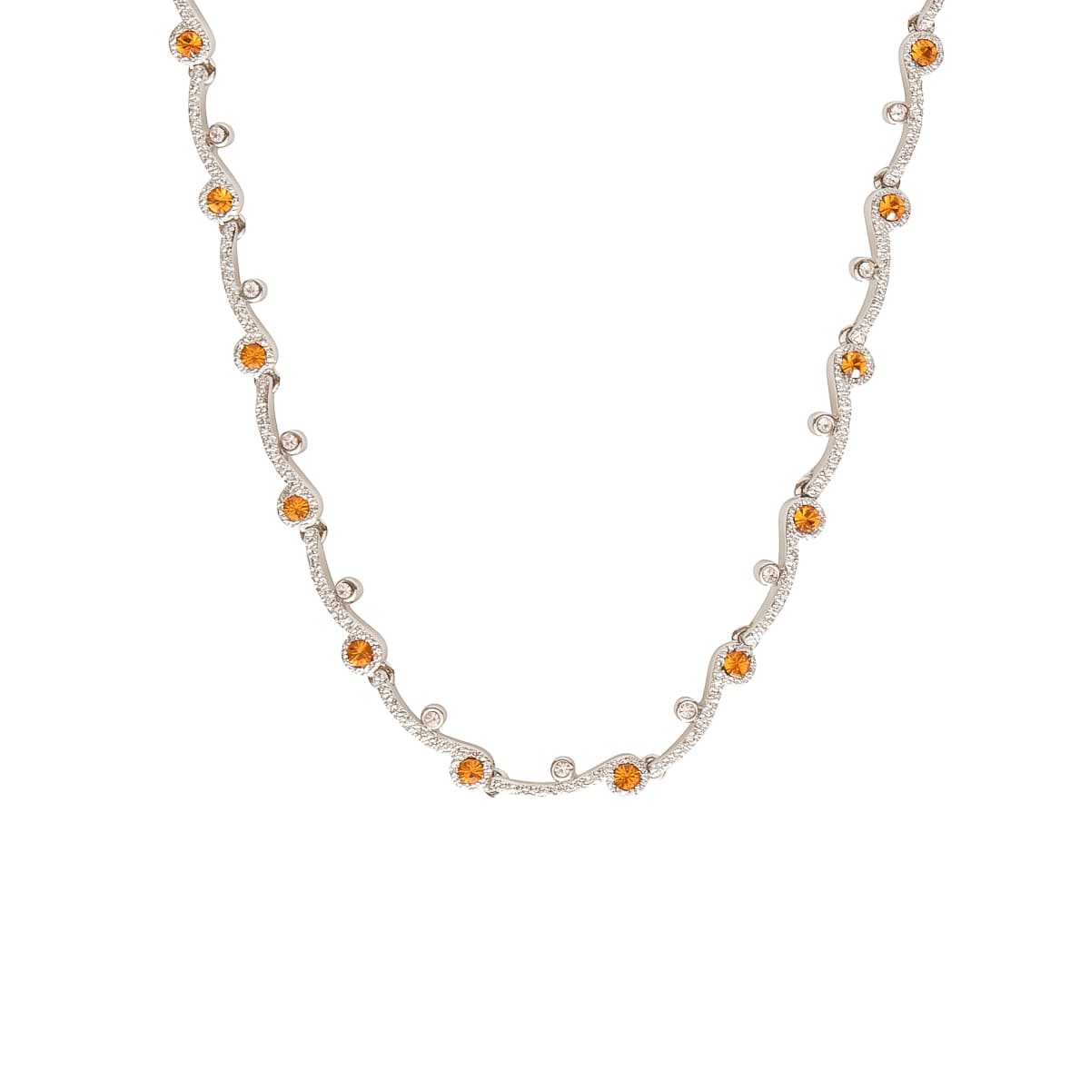 Ein modernes Collier mit femininem Design, ein Hingucker für viele Gelegenheiten. Formschöne silberfarbene Glieder mit einer geprägten Oberfläche lassen die Schmucksteine in orange und weiß noch mehr glänzen. Das Collier erscheint in elegant schicker Optik und wertet Ihr Outfit gekonnt auf.