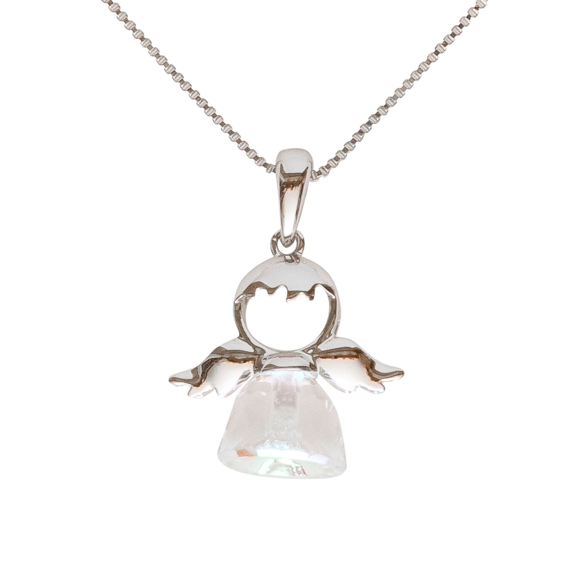 Ein liebevoll gestalteter Engel im glänzenden Kleid. Der Engel schimmert je nach Lichteinfluss in verschiedenen Farben. Eine filigrane Venezianer-Kette macht das Schmuckstück komplett. Ein schönes Geschenk für einen besonderen Menschen.