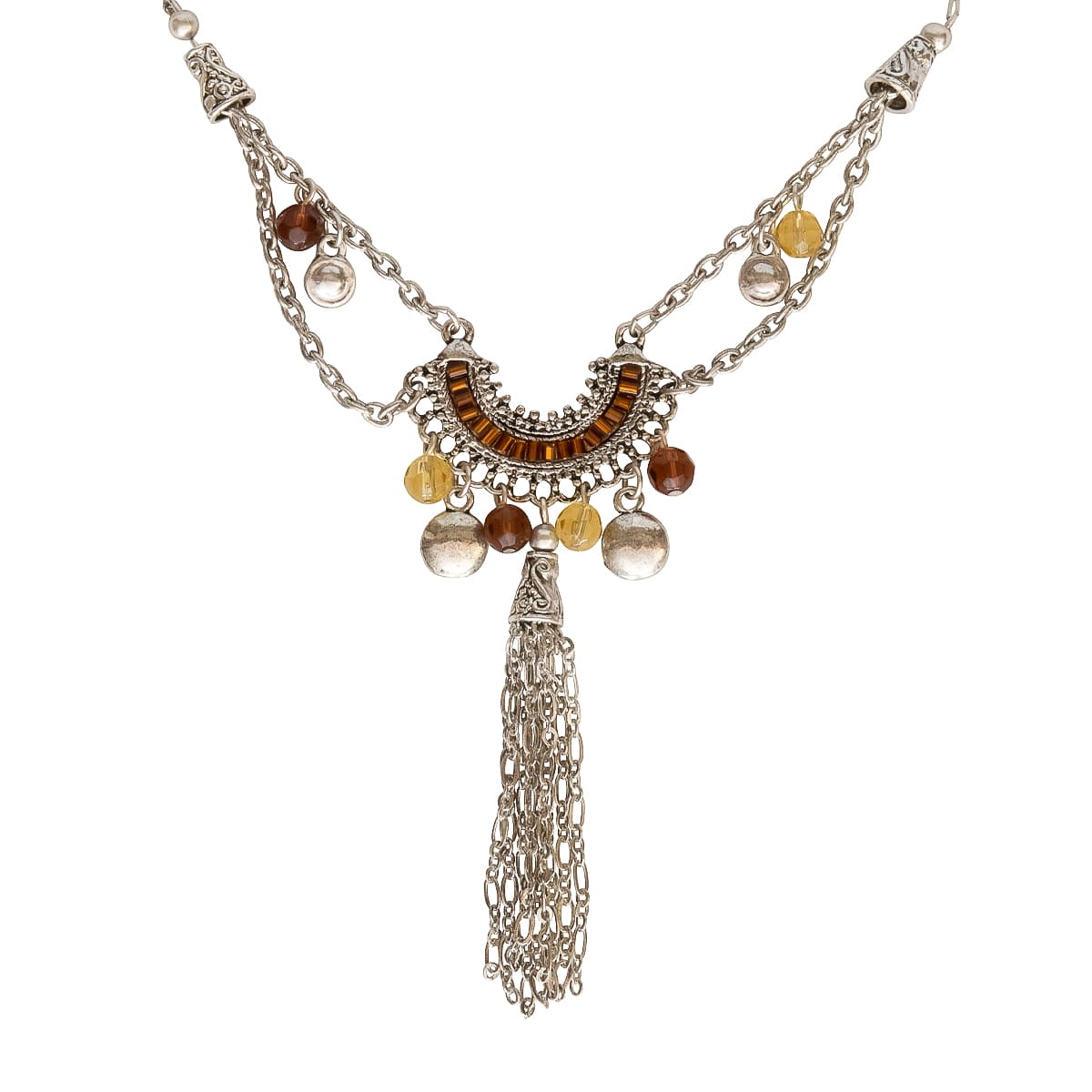 Im angesagten Hippie-Look zeigt sich die raffinierte Kette. Rote und orangefarbene Kugeln begleiten mit Metallplättchen den Anhänger. Abgerundet von einer Quaste ein schöner Eyecatcher. Ein tolles Schmuckstück, um das Gefühl von Sommer aufleben zu lassen.