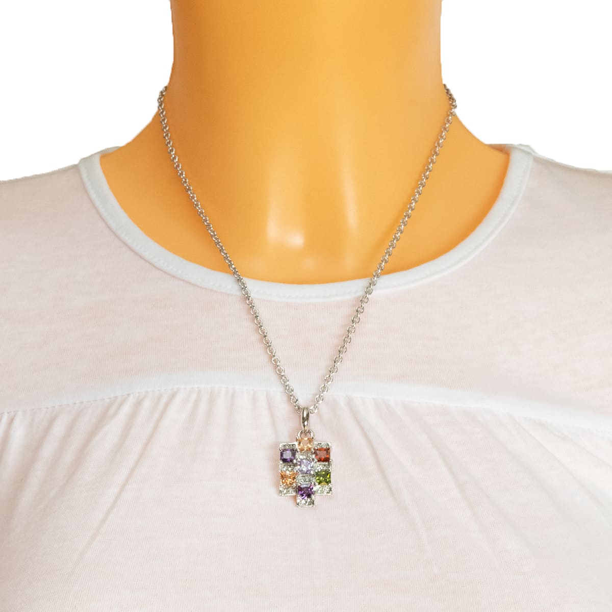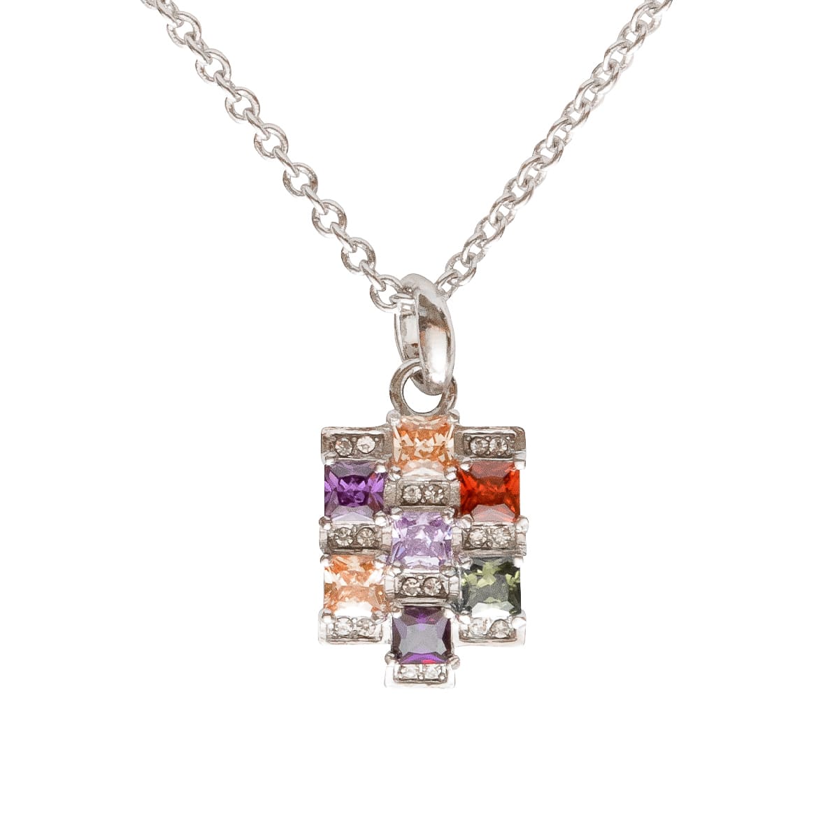 Glänzende Schmucksteine wurden in verschiednen Farben toll aufeinander abgestimmt. Der Facettenschliff der Steine sorgt für ein glänzendes Farbspiel. Funkelnde Schmucksteine runden das Design des silbernen Anhängers gekonnt ab. Die silberfarbene Ankerkette rundet das Design perfekt ab. Dank der Farbvielfalt das perfekte Accessoire für jeden Tag.