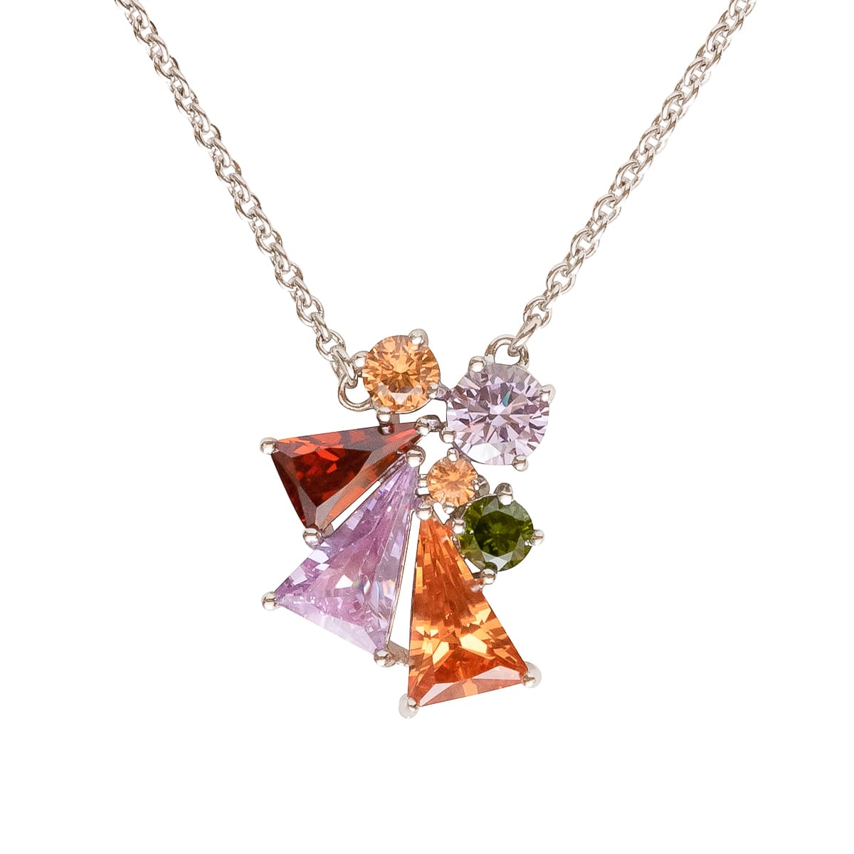 Glänzende Schmucksteine wurden in verschiednen Farben toll aufeinander abgestimmt. Der Facettenschliff der Steine sorgt für ein funkelndes Farbspiel. Die geometrisch verschiedenen Formen der Schmucksteine wurden gekonnt miteinander kombiniert. Eine silberfarbene Kette rundet das Design perfekt ab. Dank der Farbvielfalt das perfekte Accessoire für jeden Tag.