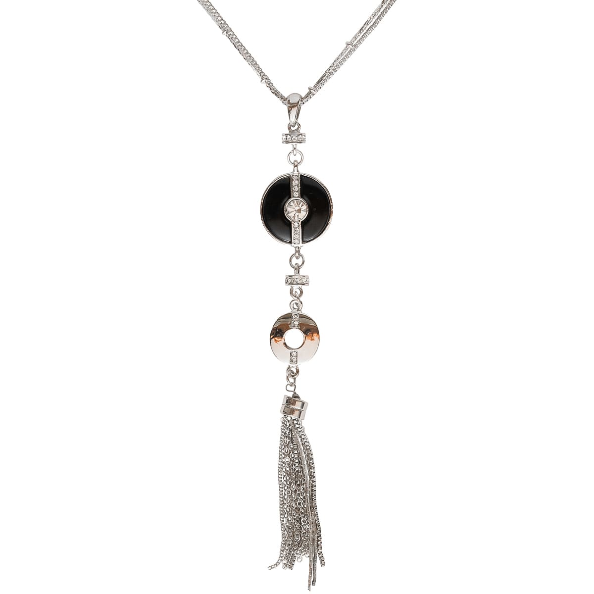Die elegante Kette ist ein echter Hingucker. Drei verschiedene Kettenarten wurden gekonnt zusammengestellt. Verschiedene Anhänger zum Teil mit funkelnden Schmucksteinen besetzt, bilden das Herzstück. Die verschiedenen Formen fügen sich perfekt zu einem harmonischen Schmuckstück. Highlight der extralangen Kette ist der Anhänger im Quastendesign. Schlichte Outfits werden perfekt in Szene gesetzt. Sehr schön zu Schwarz-Weiß Looks.