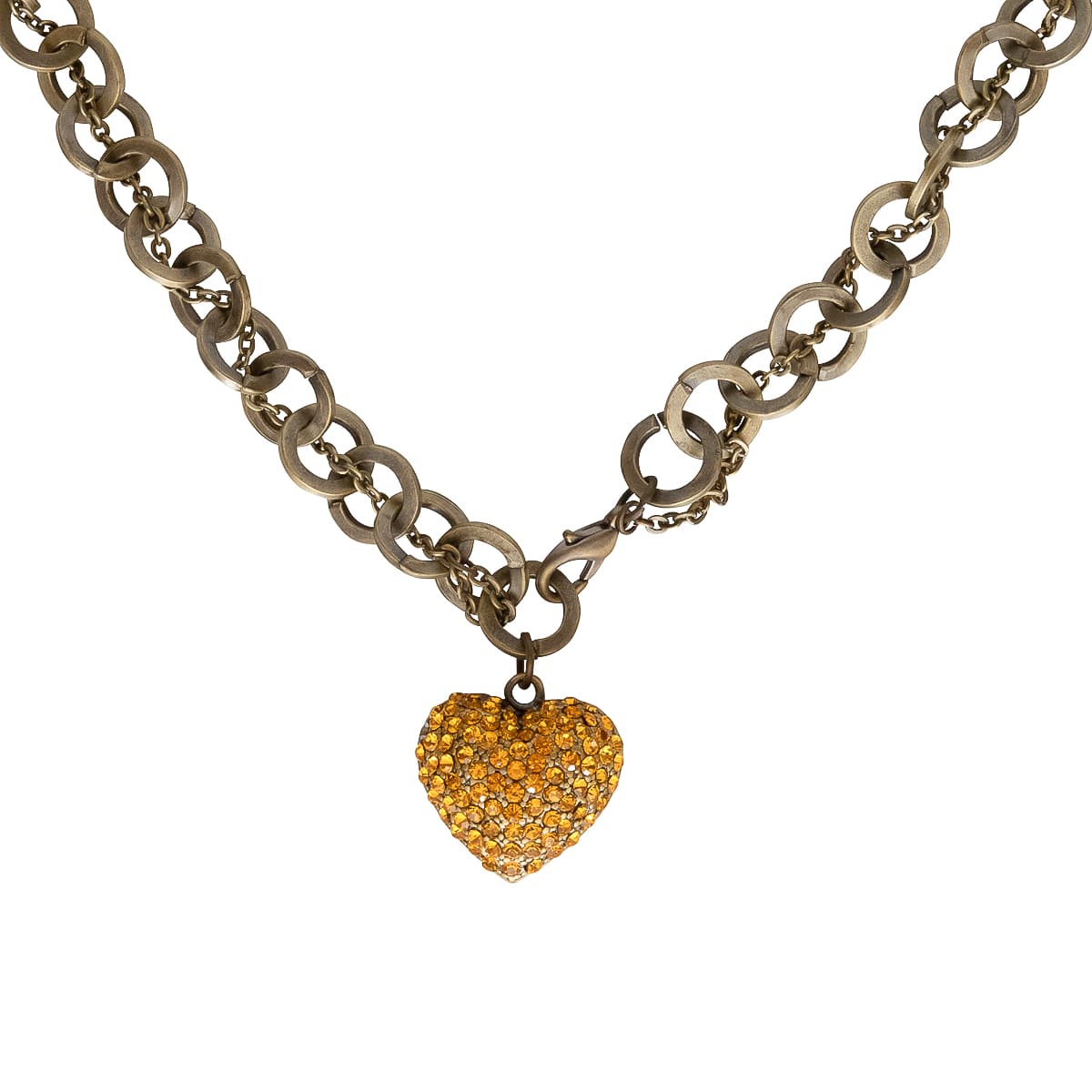 Geschickt wurden hier zwei Ketten miteinander verbunden. Der edle Herz-Anhänger ist mit funkelnden goldenen Schmucksteinen besetzt und passt perfekt zur groben Ankerkette. Raffiniert lässt sich die Kette am Anhänger öffnen. Ein besonderer Blickfang für Ihr Dekolleté.