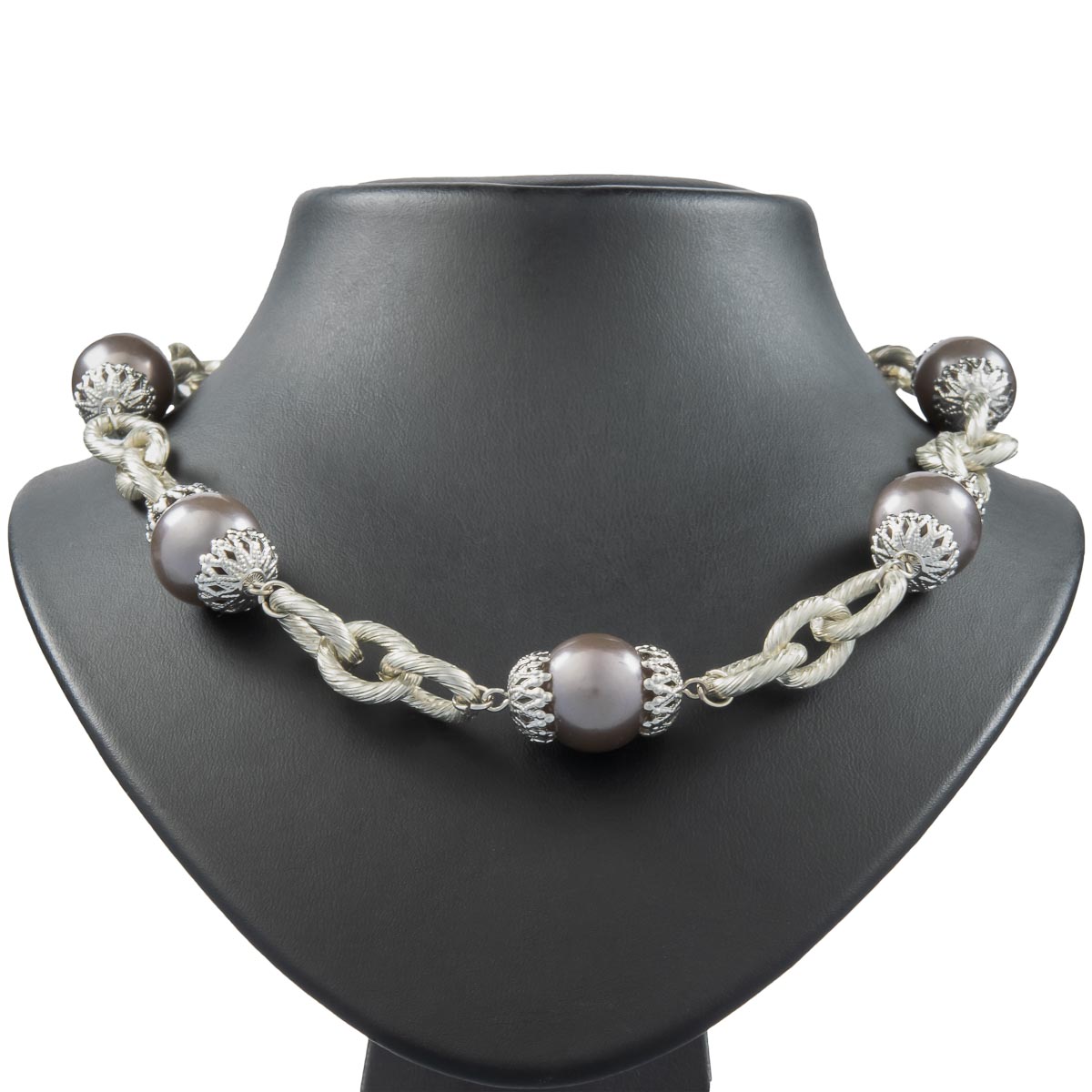 Eine grobe Ankerkette wechselt sich mit eleganten grauen Kugeln gekonnt ab. Die Kugeln werden von großen Fassungen begleitet. Durch ein Verlängerungskettchen kann die Kette individuell verlängert werden. Für einen edlen Look genau das richtige Schmuckstück.