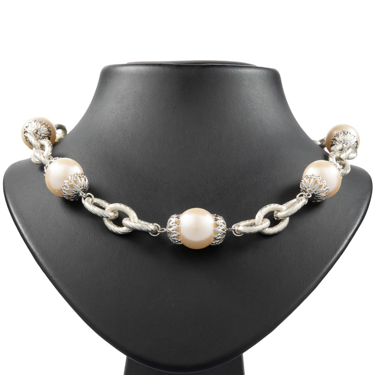 Eine grobe Ankerkette wechselt sich mit weiß schimmernden Kugeln gekonnt ab. Die Kugeln werden von großen Fassungen begleitet. Durch ein Verlängerungskettchen kann die Kette individuell verlängert werden. Durch die Länge von 90 cm ideal für um einfarbige Outfits zu unterstützen.