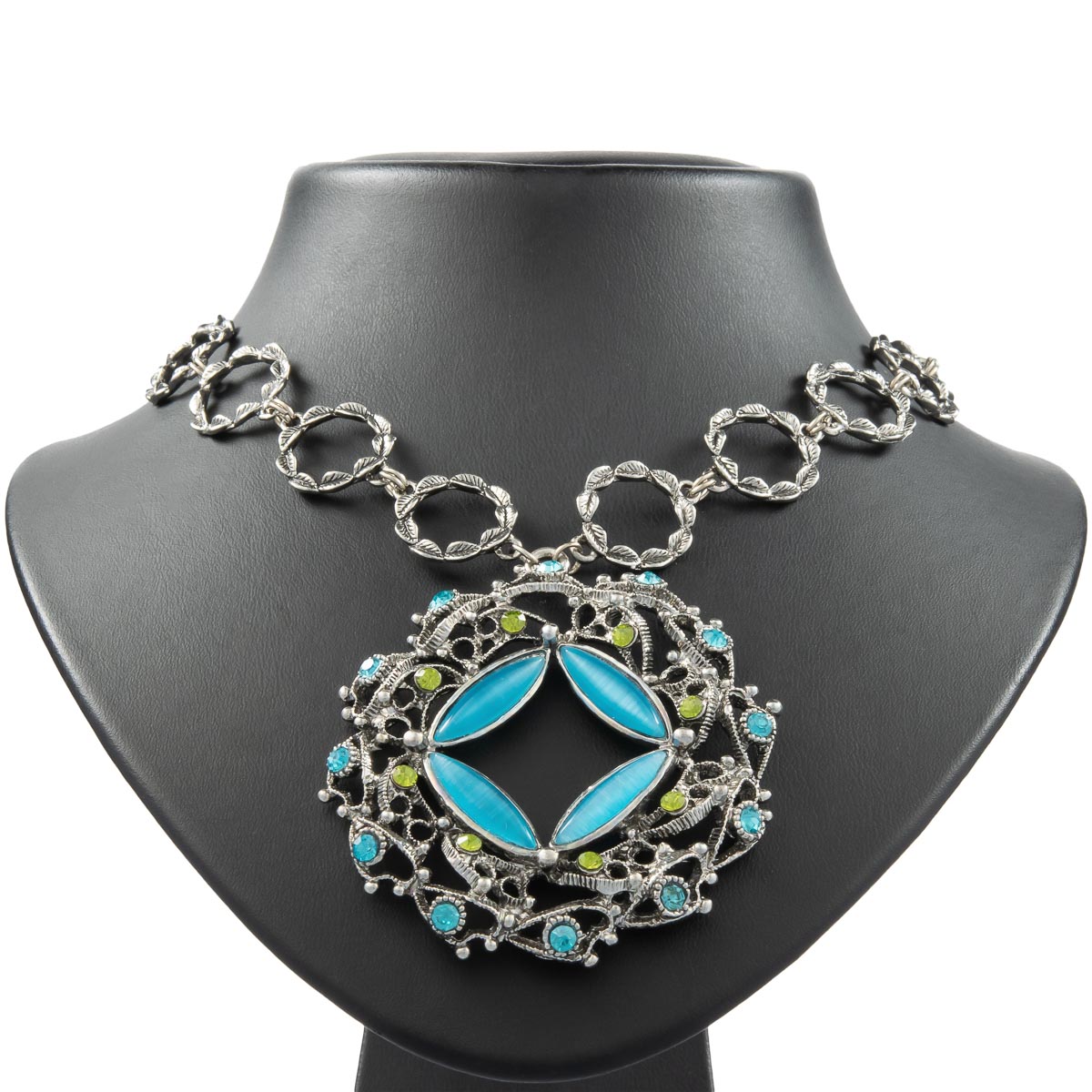 Fesch zum Dirndl und allen offenherzigen Outfits! Der große Anhänger wird von funkelnden Schmucksteinen in leuchtendem grün und türkis perfekt unterstützt und lenkt die Blicke gekonnt auf Ihr Dekolleté. Die einzelnen Glieder der Kette sind liebevoll durch kleine, aneinandergereihte Blätter dargestellt.