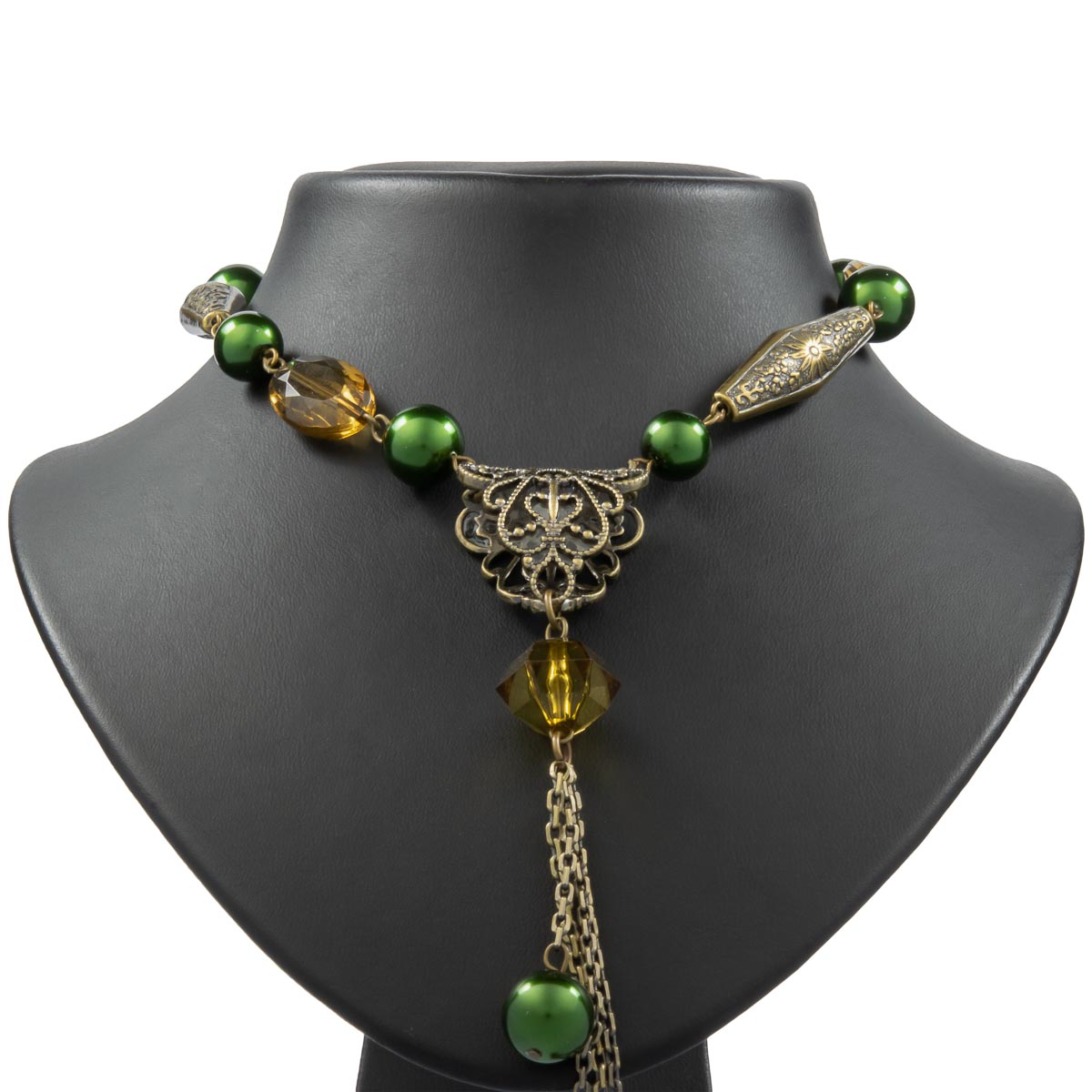 Ein schickes Schmuckstück im angesagten Vintage-Look. Grüne Kugeln wechseln sich mit verschiedenen Metall- und Kunststoffelementen in aufeinander abgestimmten Grüntönen und antikgoldfarben gekonnt ab. Die liebevoll gestaltete Kette zeigt einen antikgoldfarbenen Anhänger mit Quaste. Überzeugt mit seiner elegant schicken Optik.