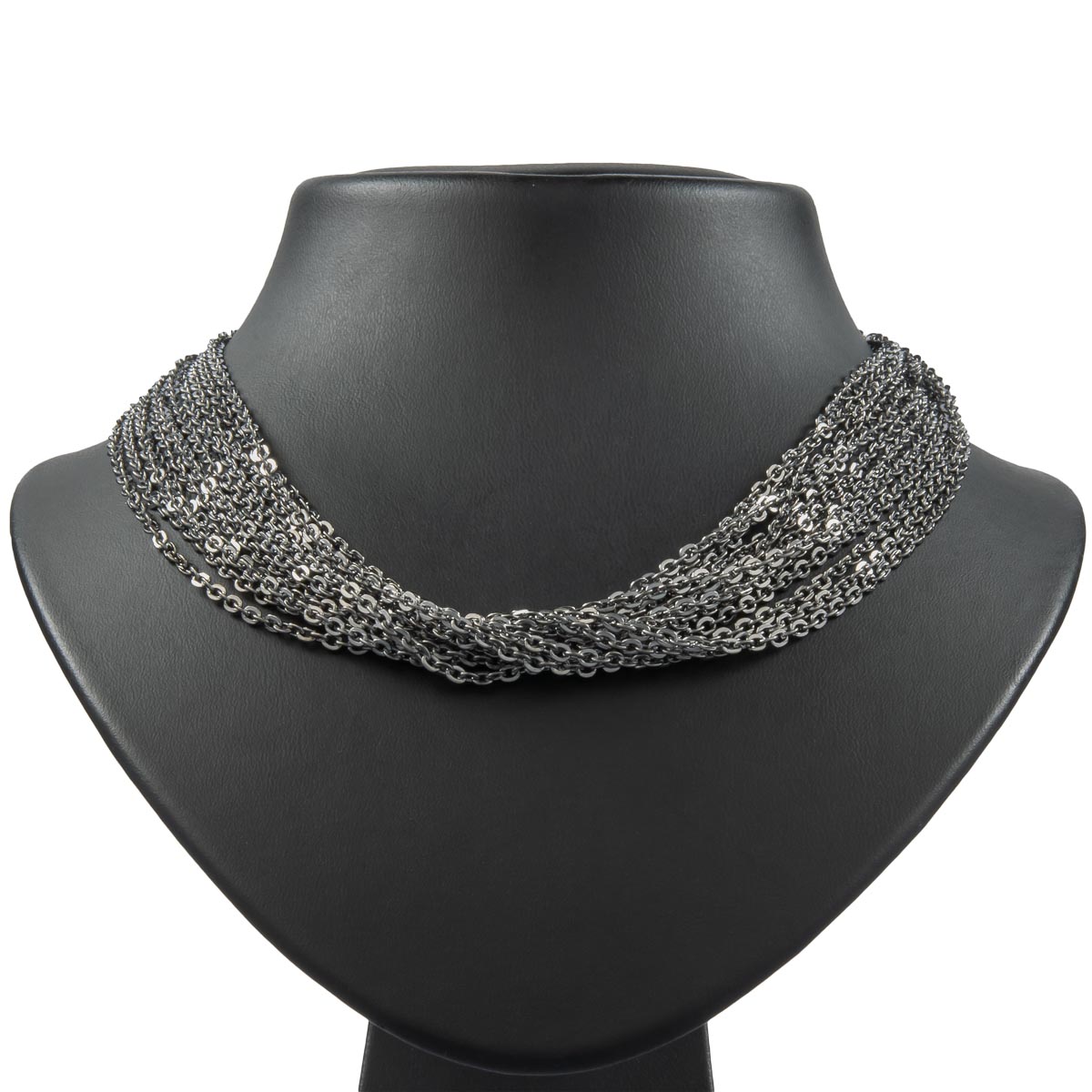 Zwölf filigrane Ankerketten in schickem schwarz wurden zu einem edlen Collier zusammengestellt. Dieses besondere Schmuckstück fasziniert mit seiner Eleganz.