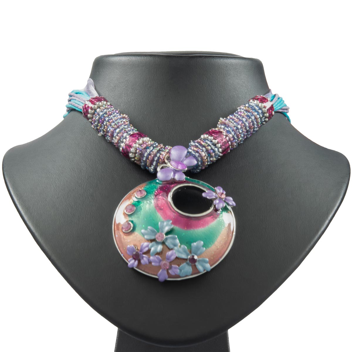 Ein schöner Begleiter für den Sommer! Der schicke Anhänger schimmert in pink, grün und kupferfarben. Blüten in blau und violett werden von funkelnden violettfarbenen Schmucksteinen unterstützt. Ein violettfarbener Schmetterling dient als Übergang zur Kette. Hier wurden blaue und fliederfarbene Schnüre mit Organzaband verbunden. Liebevoll gestaltete Zierringe begleiten die Kette und vollenden das gelungene Design.