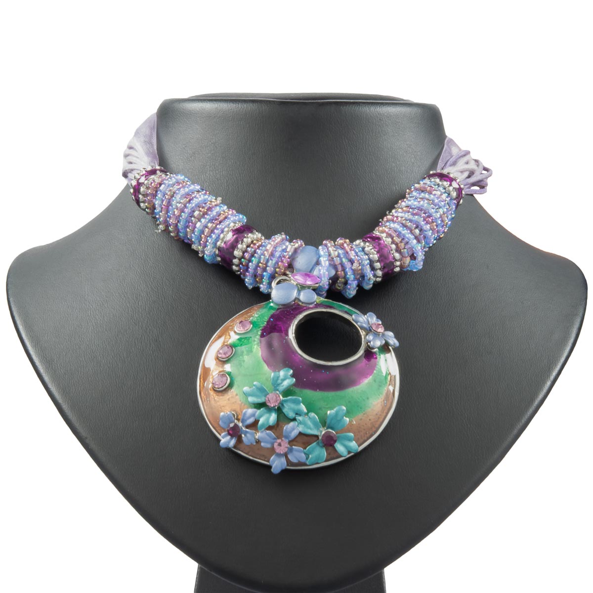 Ein schöner Begleiter für den Sommer! Der schicke Anhänger schimmert in Pink, Grün und kupferfarben. Blüten in Grün und Blau werden von funkelnden violettfarbenen Schmucksteinen unterstützt. Ein blauer Schmetterling dient als Übergang zur Kette. Hier wurden fliederfarbene Schnüre mit Organzaband verbunden. Liebevoll gestaltete Zierringe begleiten die Kette und vollenden das gelungene Design.