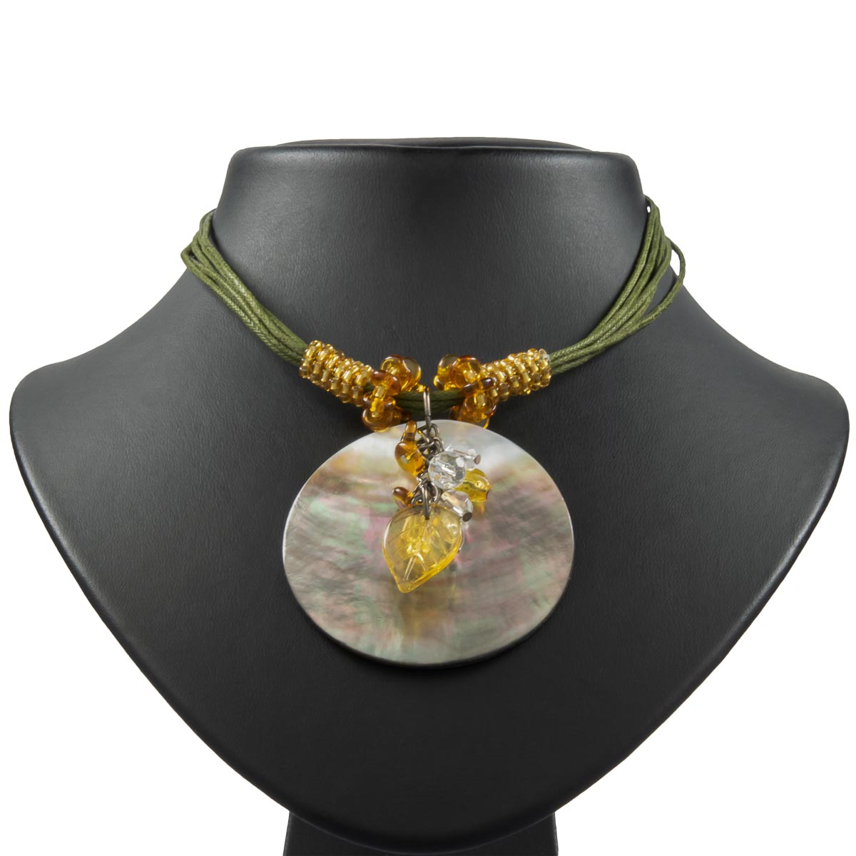 Für den perfekten Sommer-Look. Die Abalone Muschel als schimmernder Anhänger kombiniert mit verschiedenen braunen Plastikelementen. Die grünen Schnüre setzen mit den farblich abgestimmten Zierringen gekonnt Akzente. Durch das Verlängerungskettchen individuell tragbar. Ein echter Hingucker!