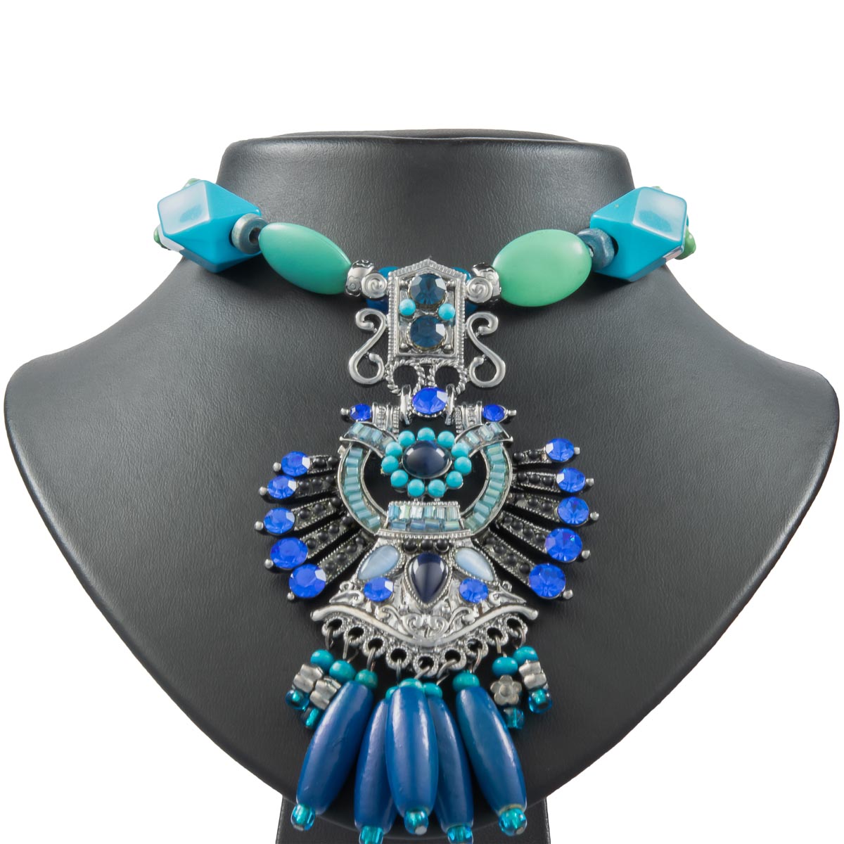Sommer, Sonne, Sonnenschein. Die schicke Statement-Kette im Hippie-Style macht Lust auf Sommer! Dunkelblaue Schnüre werden von Plastikelementen in verschiedenen Grün- und Blautönen unterstützt. Funkelnde Schmucksteine in Blau bringen den vielfältigen Anhänger zum Strahlen.