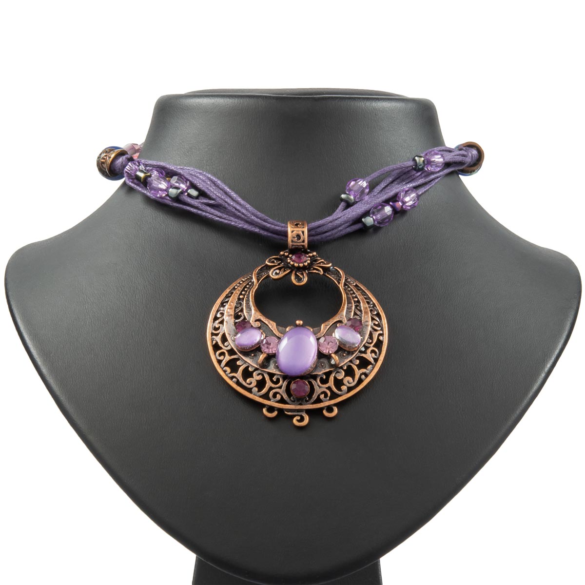 Ein wunderschönes Schmuckstück im angesagten Vintage-Look. Der antikkupferfarbene Anhänger wird von violetten und fliederfarbenen funkelnden Schmucksteinen in Szene gesetzt. Die Violettfarbenen Schnüre werden liebevoll von farblich abgestimmten Kunststoffelementen begleitet und ergänzen den Anhänger gekonnt. Durch ein Verlängerungskettchen ist das Schmuckstück individuell zu tragen. Setzen Sie modische Akzente.