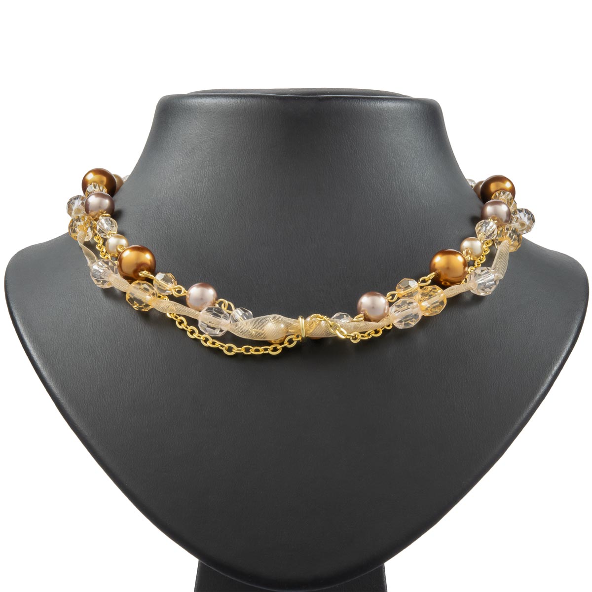 Drei verschiedene Ketten wurden liebevoll zu einem verspielten Schmuckstück vereint. Perlen in Braun, Beige und Grau wechseln sich gekonnt mit goldfarbenen und weißen Kunststoffelementen ab. Auch das goldene Organzaband wird von den weißen und goldfarbenen Kugeln begleitet. Dank des kleinen Verlängerungskettchens individuell tragbar. Ein Schmuckstück, das Ihr Styling perfekt abrundet.